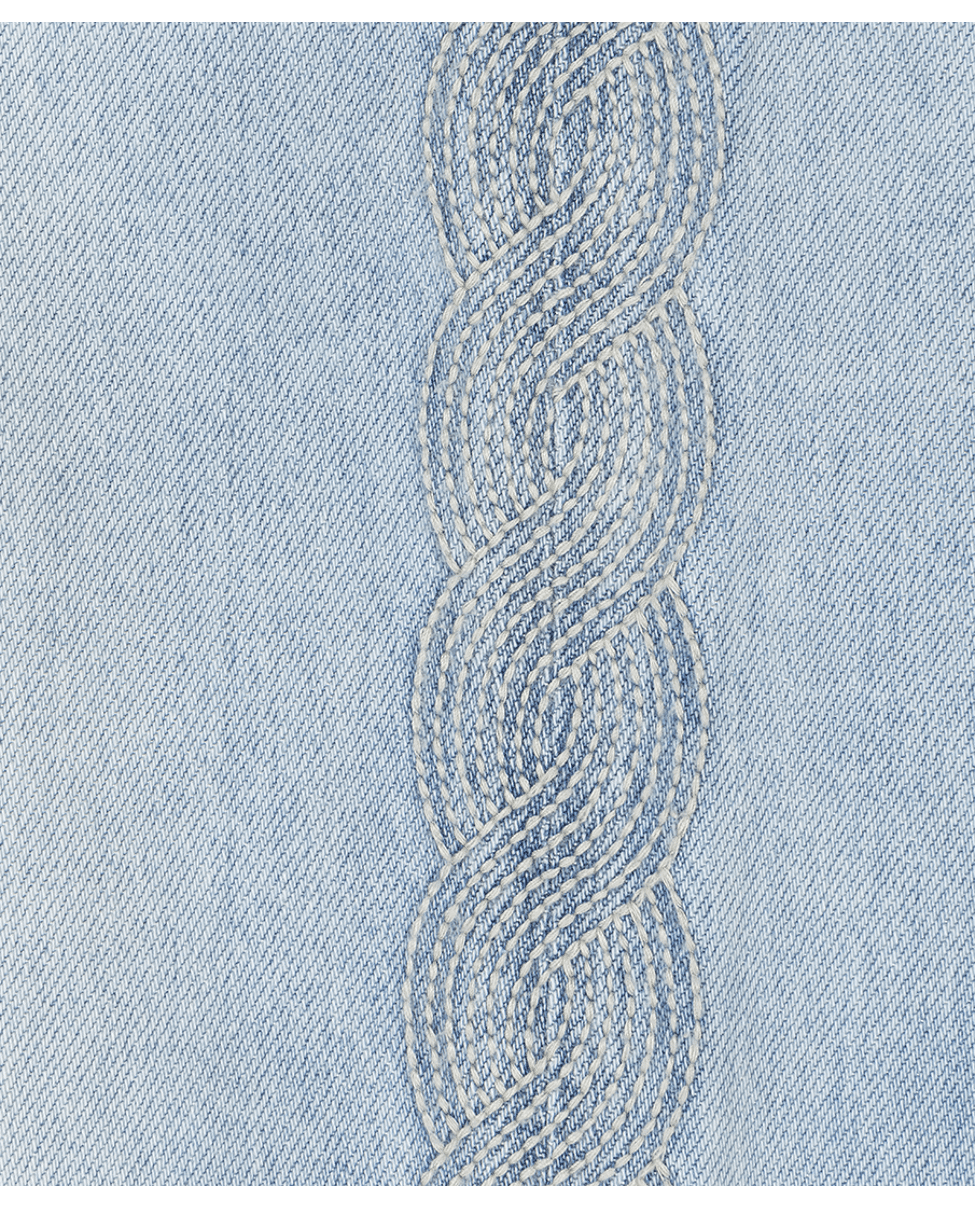 De sierlijke embroidery op lichtblauwe denim geeft een zachte twist aan een tijdloze klassieker.