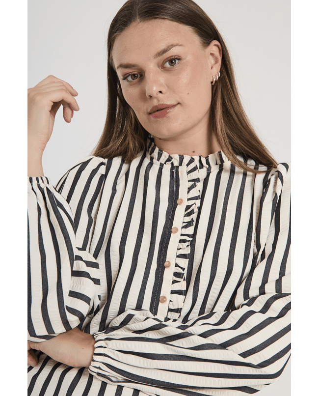 Luchtige blouse met verticale streep en verfijnde ruches langs de knoopsluiting. Een vrouwelijke touch op een tijdloos silhouet, perfect voor werk of weekend.