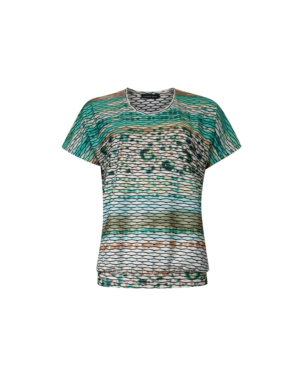 Luchtige blouson top met ronde hals van Roberto Sarto in een opvallende green brush stroke print. De combinatie van strepen en zachte kleurovergangen geeft dit dames T-shirt een moderne, artistieke uitstraling. Ideaal voor een zomerse dag met een lichte broek of rok.