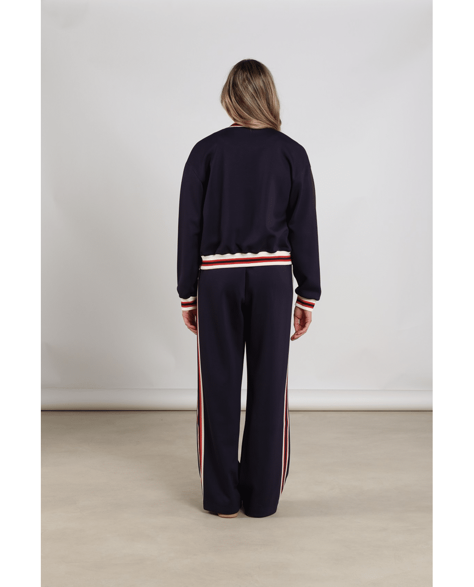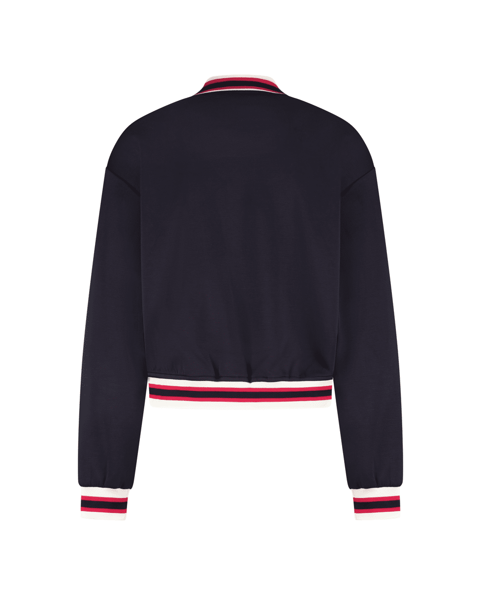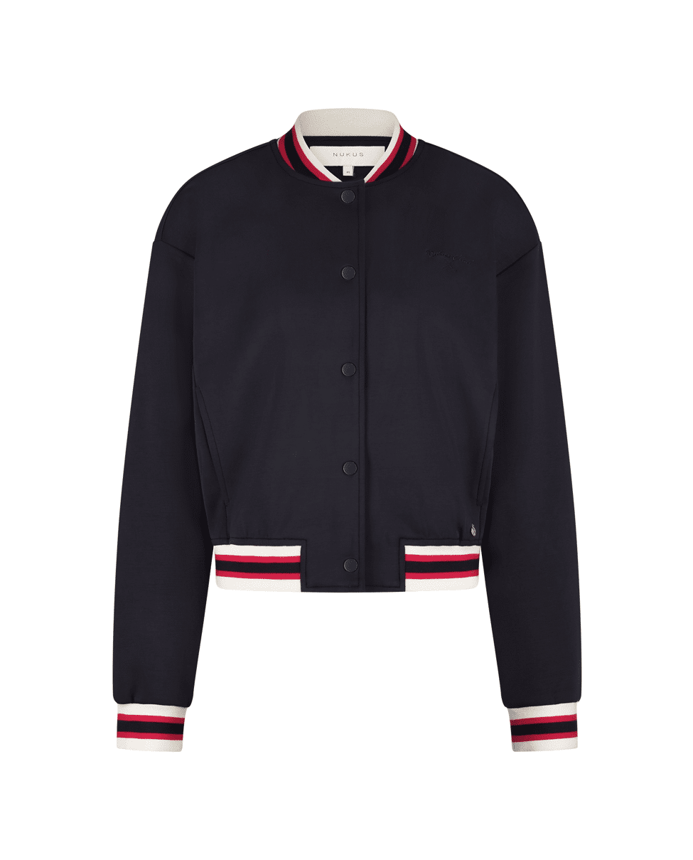 De Nina Jacket in navy heeft een tijdloos bombermodel met contrasterende boorden. Combineer met denim, sneakers of juist vrouwelijker met een jurk.
