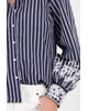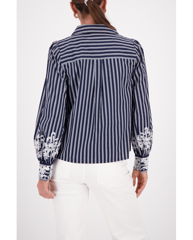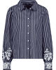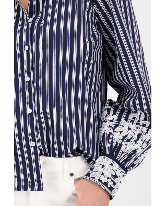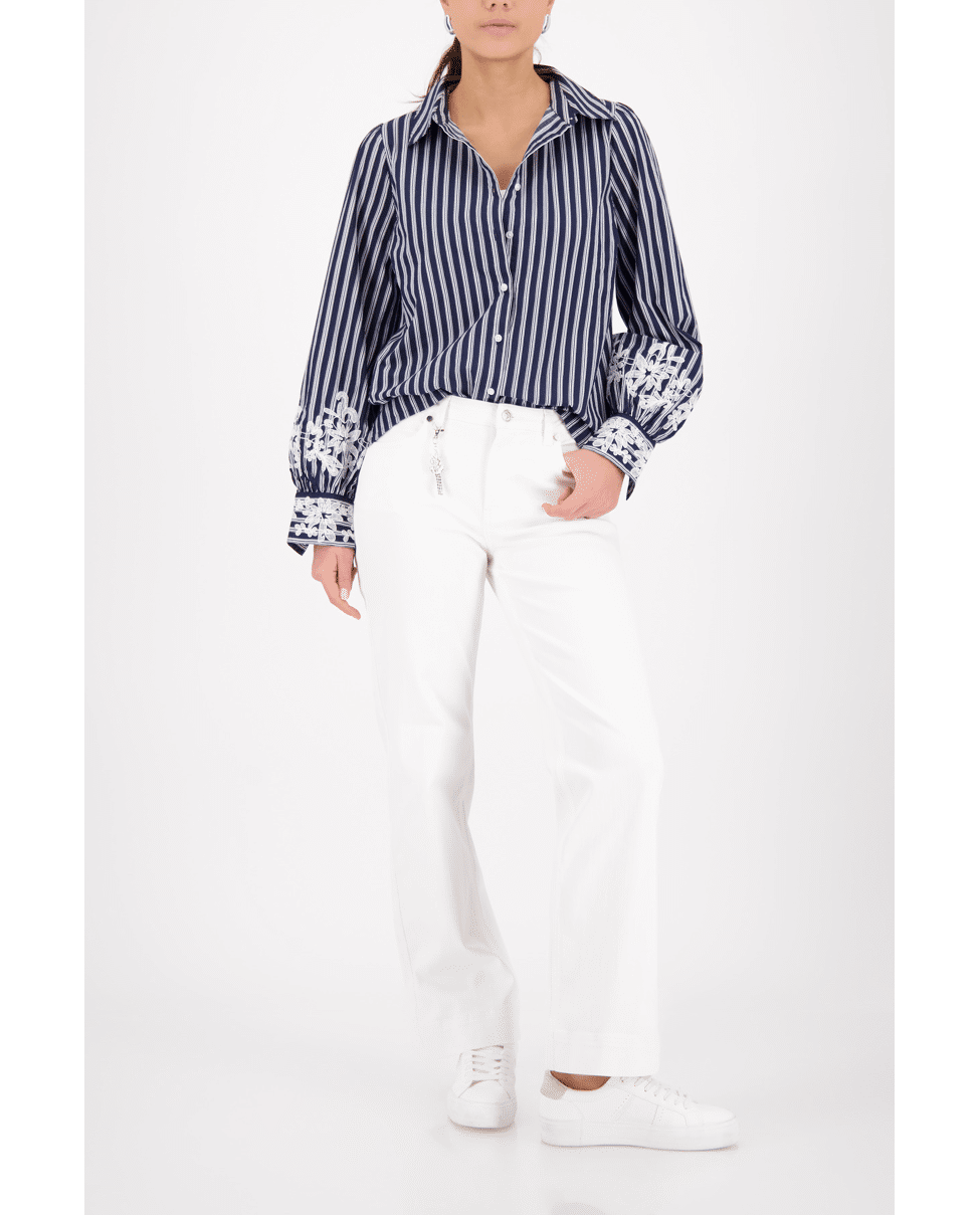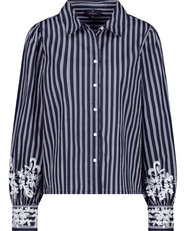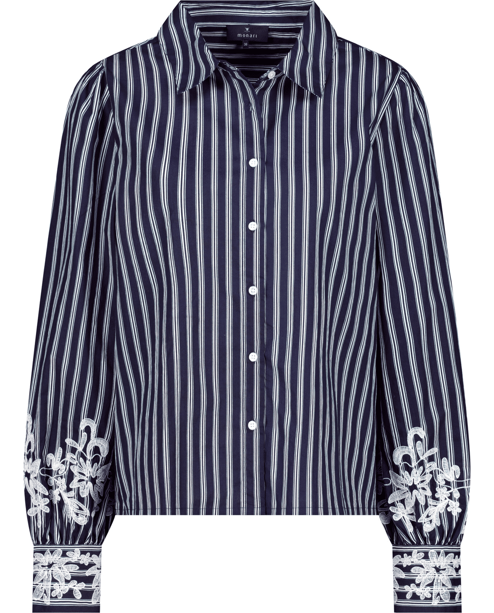 Dames blouse van Monari met strepen, kanten versiering op de lange mouwen, klassieke kraag en knoopsluiting