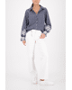 Een klassieke blouse met verticale strepen en opvallend kant op de mouwen. Voor een elegante twist op een tijdloze stijl.