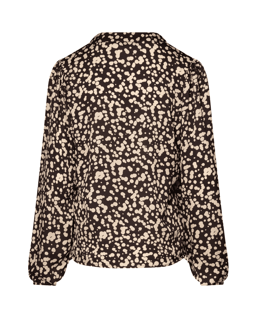 Luchtig, vrouwelijk en moeiteloos stijlvol. Deze bruine blouse met abstracte stippenprint en V-hals is een verfijnde basic voor het herfst-winterseizoen. Combineer met denim, wol of leer – alles kan.