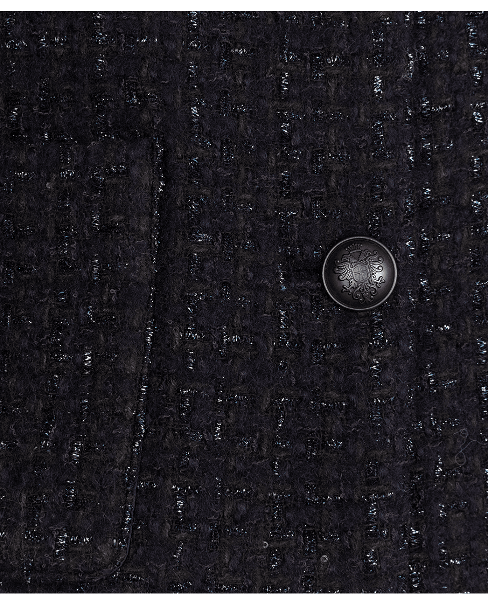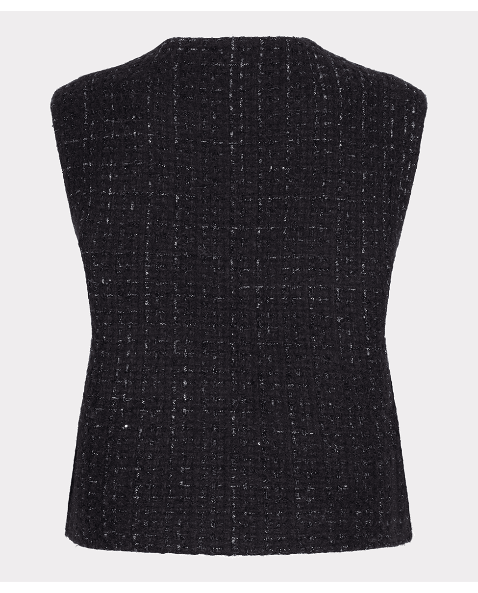 Een klassiek gilet in moderne tweed, uitgevoerd in een diepe antracietkleur. Perfect om te combineren met een blouse, coltrui of als onderdeel van een gecoördineerde look.
