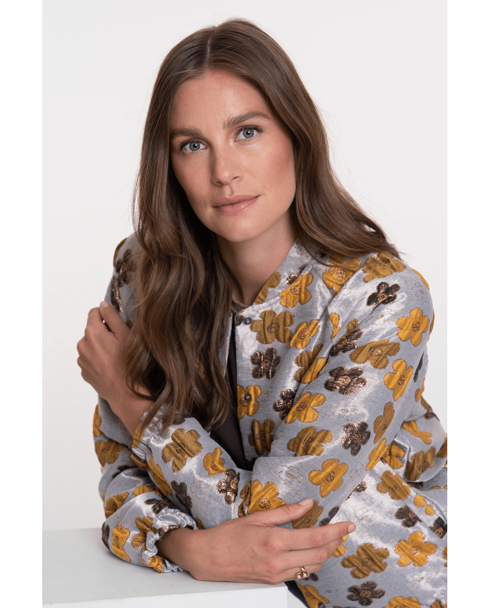 Op zoek naar een eyecatcher voor het najaar? Dit korte jasje in grijs met gele bloemenprint brengt flair en fun in elke outfit. Perfect voor bijzondere gelegenheden of gewoon, omdat het kan.