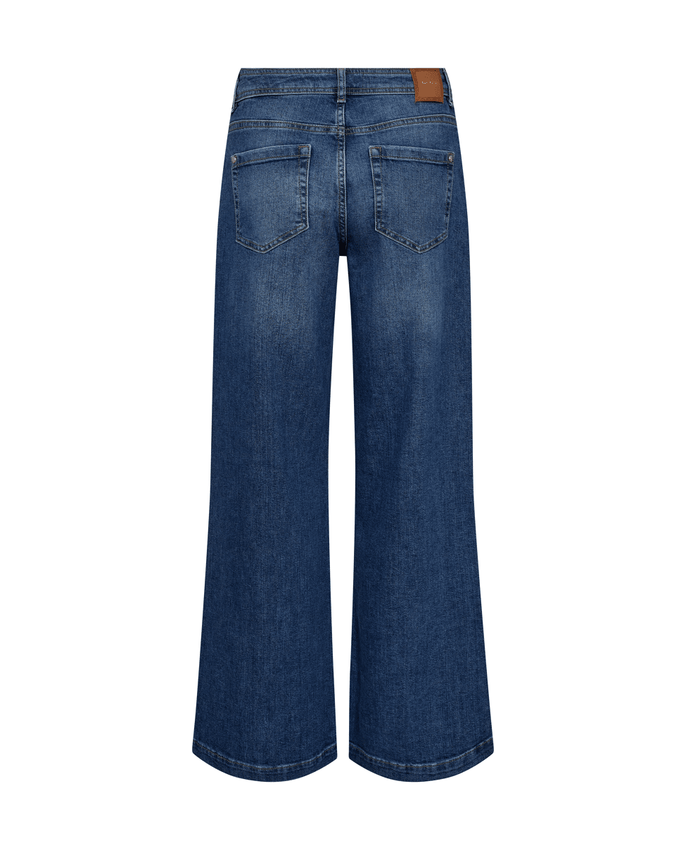 Brede pasvorm met flared pijpen en aansluitende taille. Lengtemaat geschikt voor langere benen.