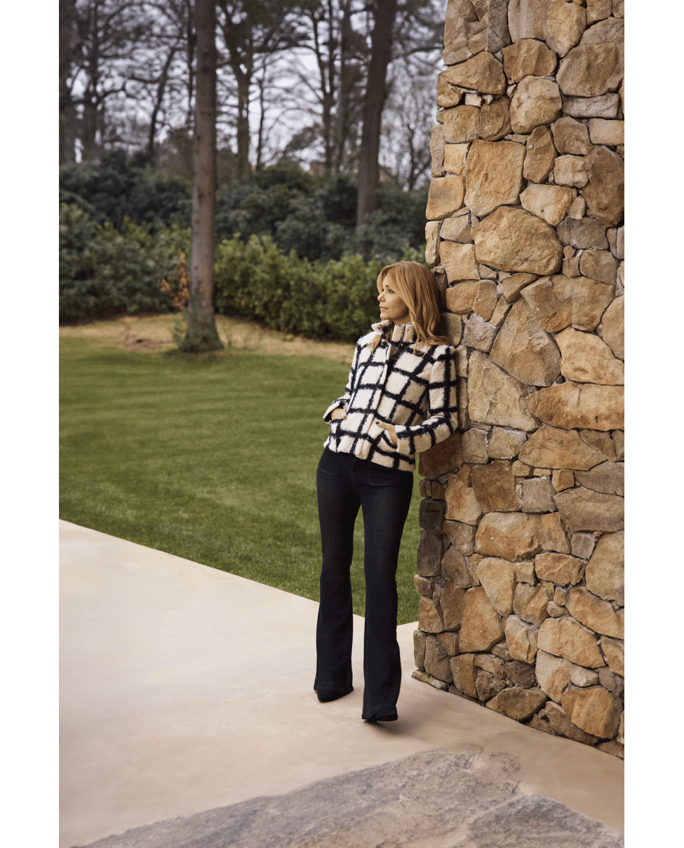 De hoge taille en flared pijpen geven een zelfverzekerd silhouet, met een subtiele knipoog naar de seventies.