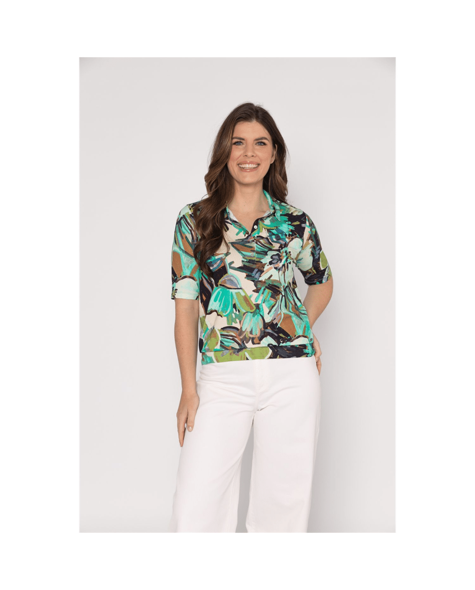 Blouson dames T-shirt met polo kraag van Roberto Sarto in een frisse A.Green-Mint print met geschilderde bloemen. De combinatie van mint, groen en zachte natuurtinten geeft dit item een zomerse, levendige uitstraling. Perfect op een lichte broek of denim voor een comfortabele maar verzorgde look.