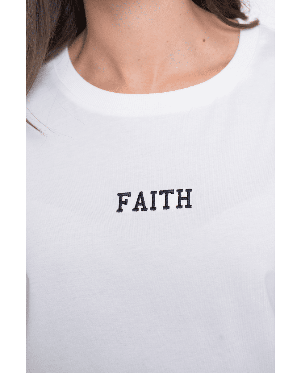 De subtiele ‘FAITH’-borduring maakt het T-shirt bijzonder, terwijl het makkelijk te combineren blijft.