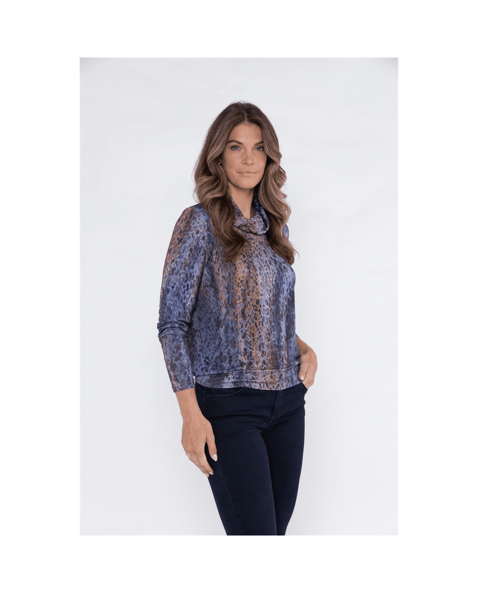 Een blouson pullover met hangcol in Dutch blue-mocca animal print. Het zachte breisel en de elastische onderboord zorgen voor een comfortabele pasvorm en een stijlvolle uitstraling.