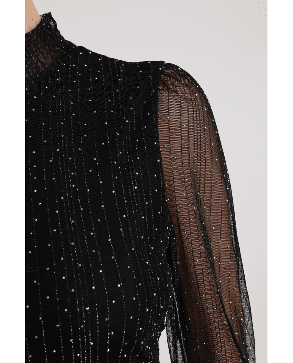 Een verfijnde top met glinsterende strassdetails, perfect voor feestelijke avonden of een stijlvolle dinner date. De semi-transparante stof geeft een elegante touch, terwijl de stretch zorgt voor een comfortabele fit.