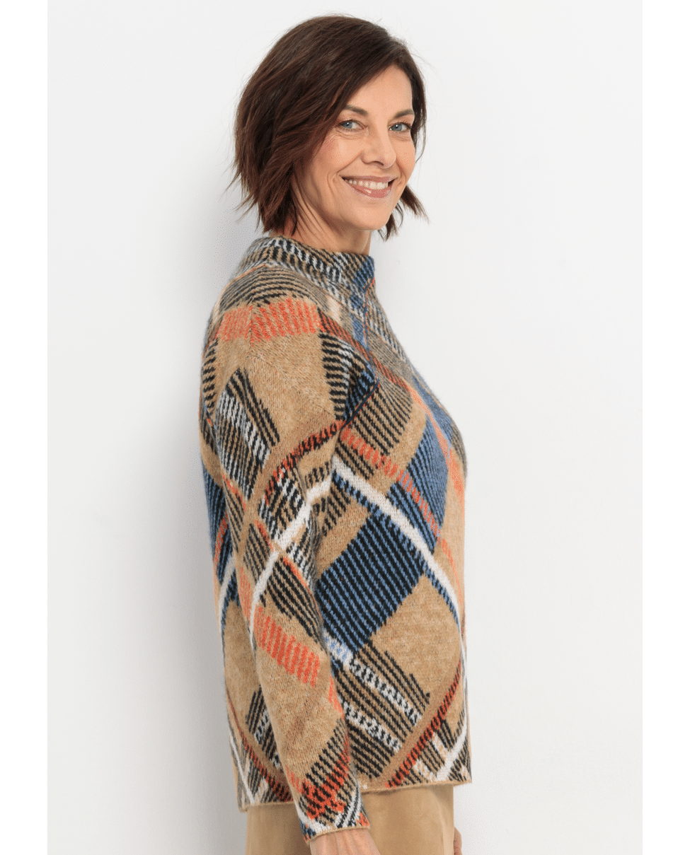Deze ruitgebreide trui combineert comfort met kleur en karakter. Ideaal voor frisse dagen waarop je stijlvol én warm voor de dag wilt komen.