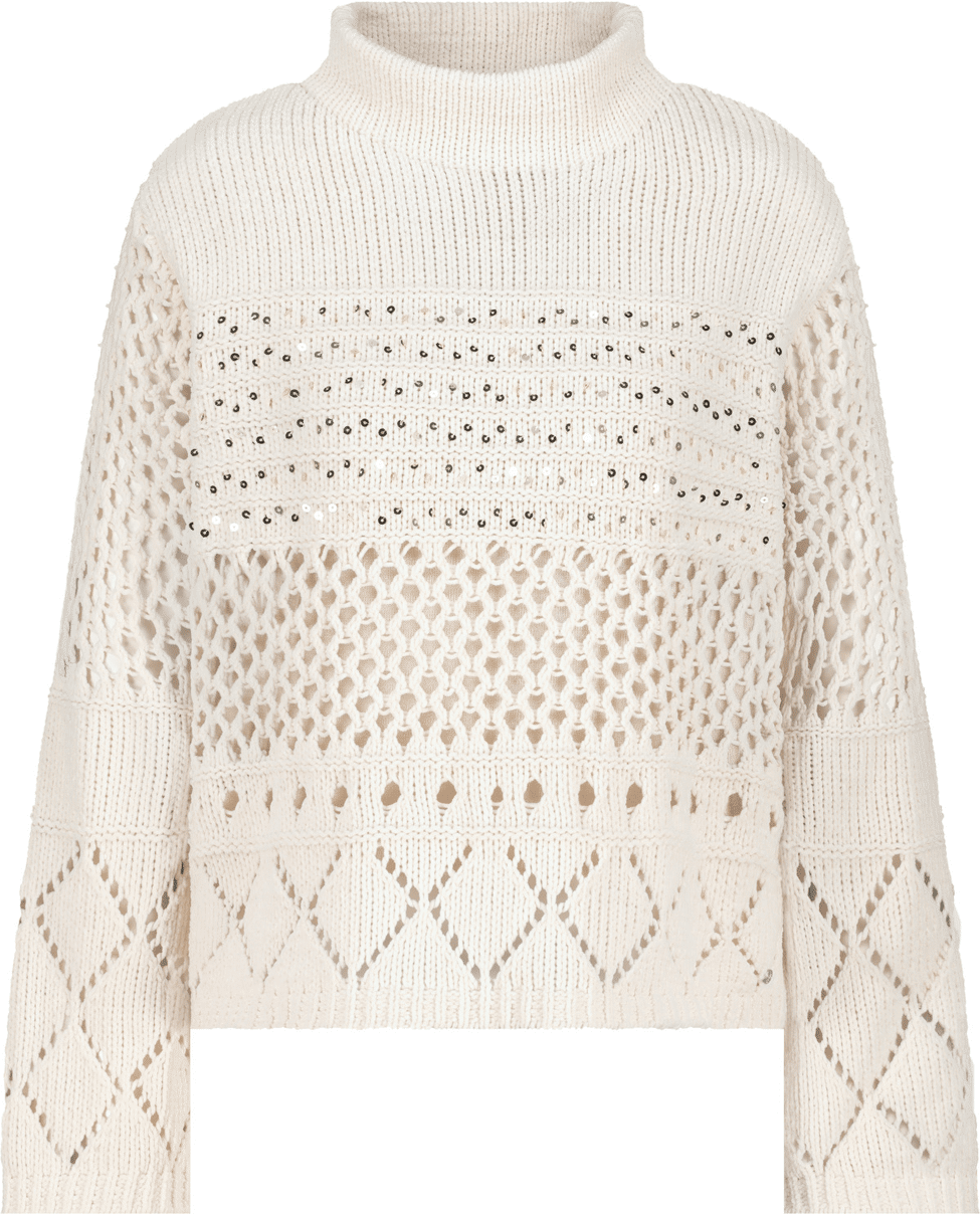 Gebreide ajourtrui, met speelse patronen en licht wijde mouwen. Perfect voor gelaagde looks in de herfst en winter.