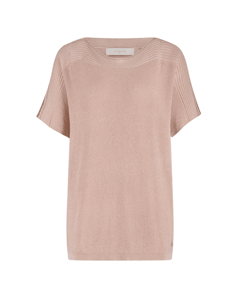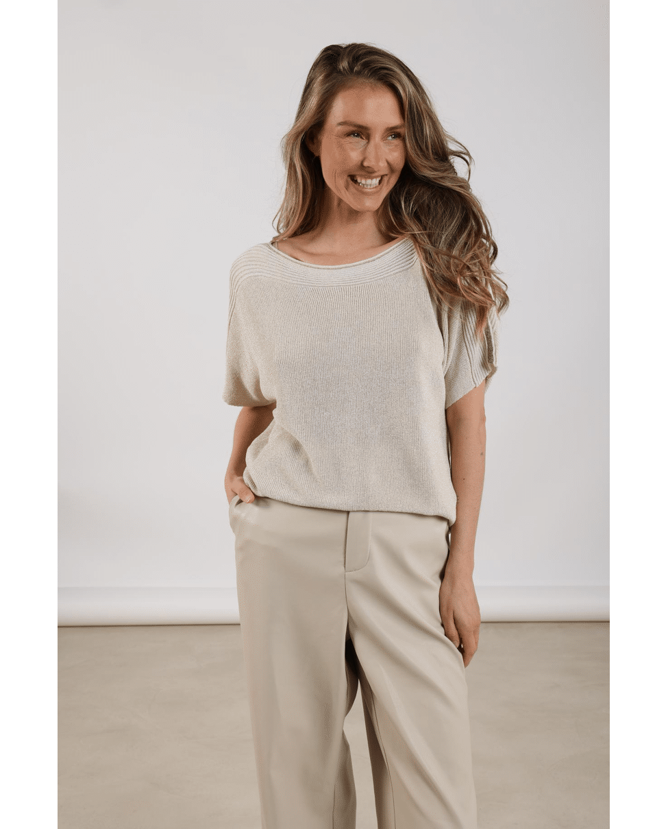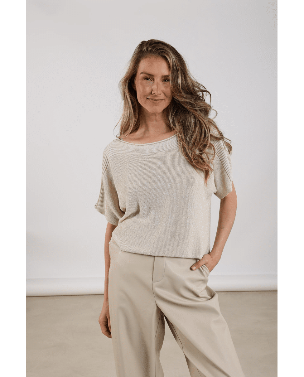 Merla Top Lurex – Gebreide damestrui van Nukus met subtiele glans, korte mouwen en boothals
