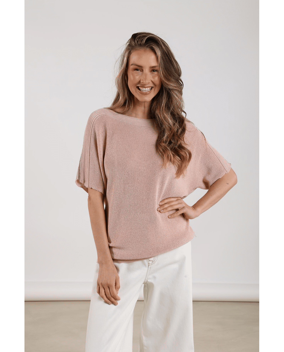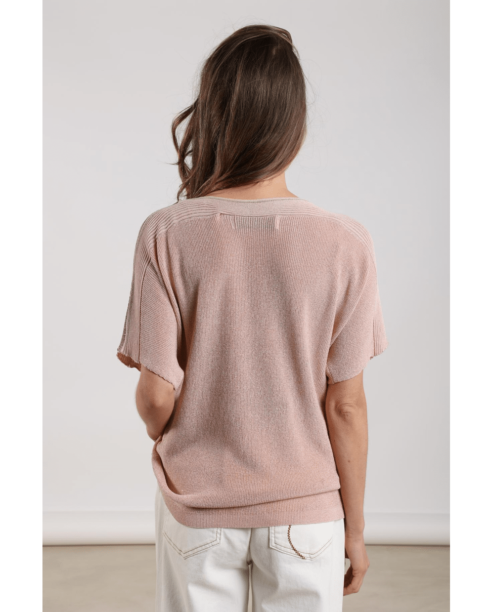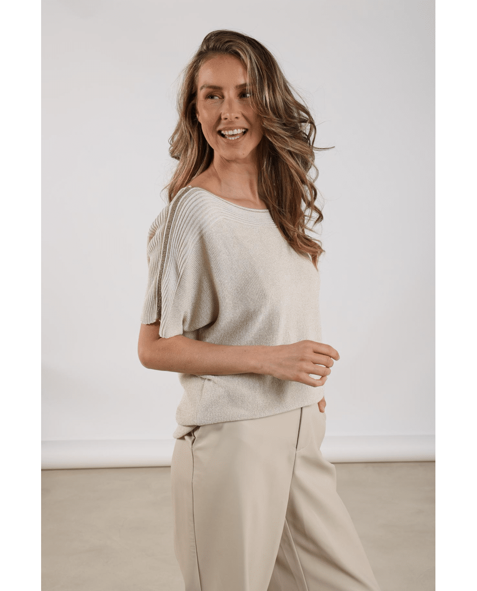 Merla Top Lurex – Gebreide damestrui van Nukus met subtiele glans, korte mouwen en boothals