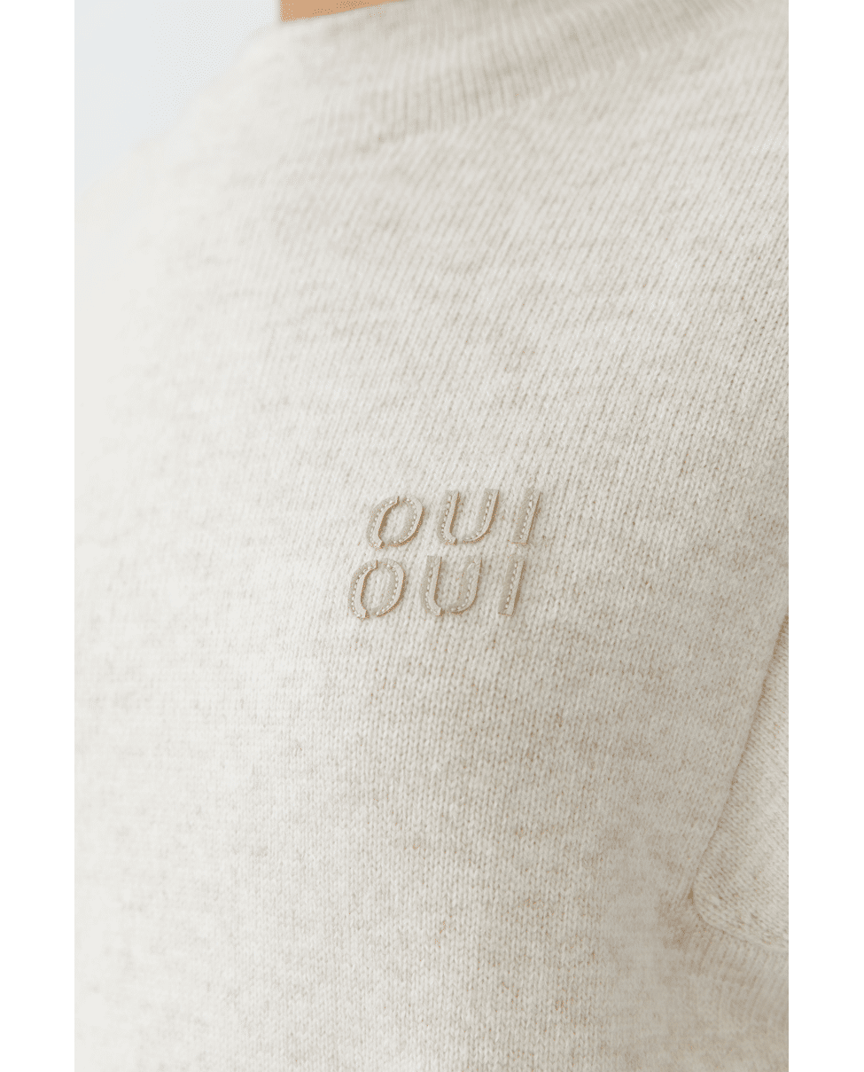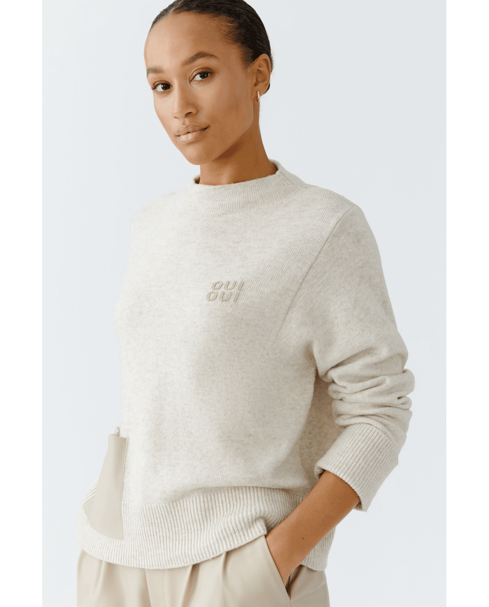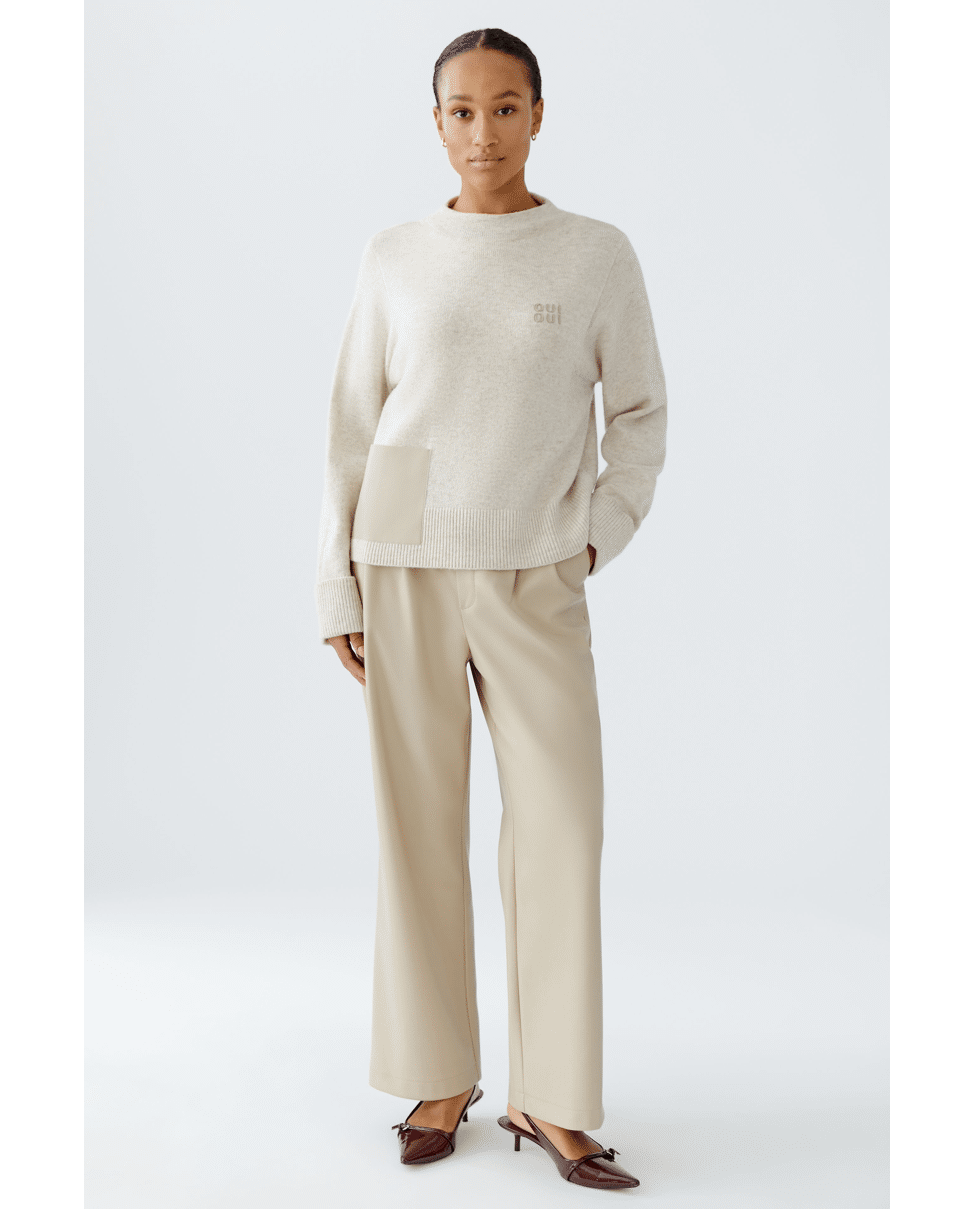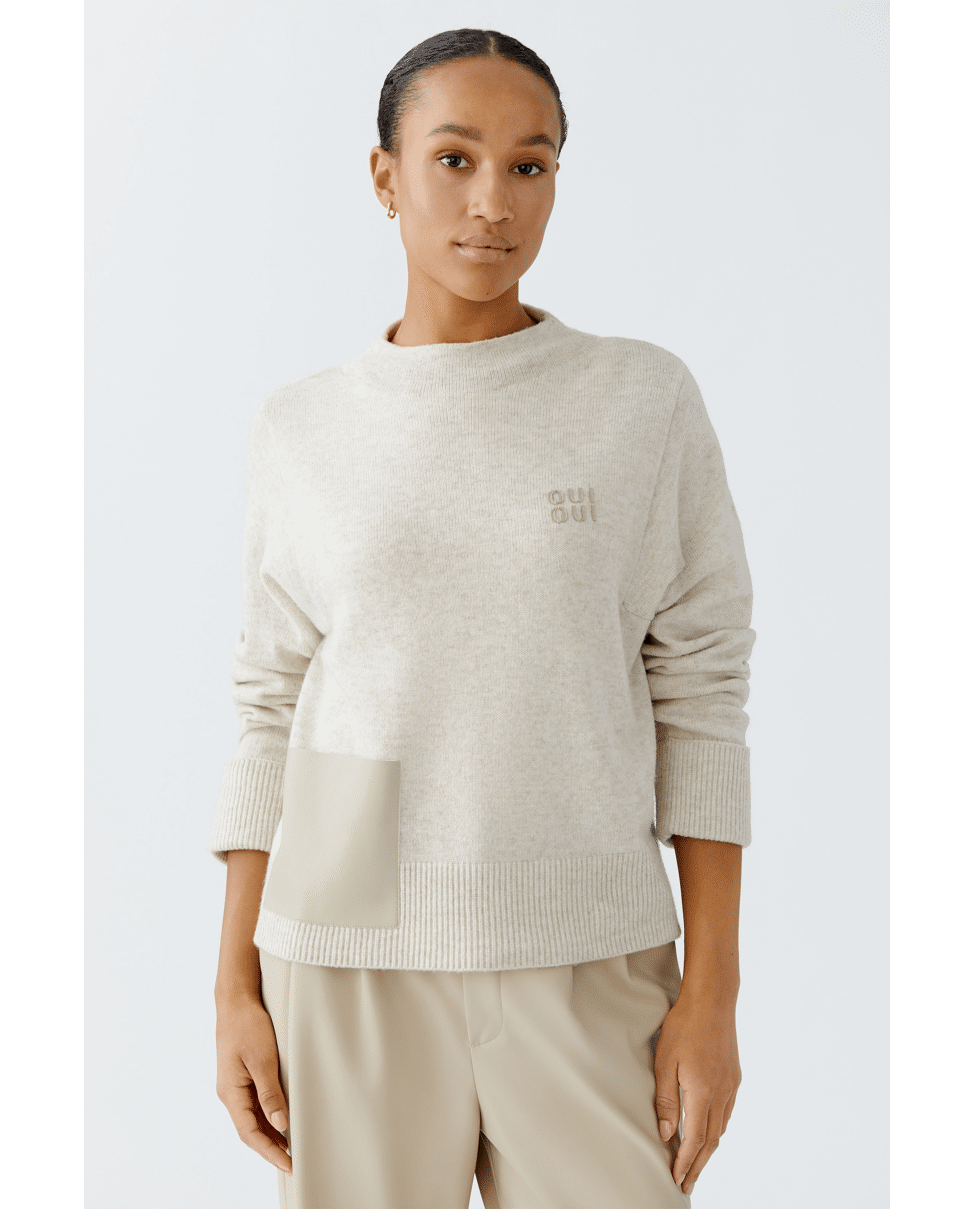 Gebreide damestrui van Oui met zakje in leerlook, ronde hals, geborduurd logo en lange mouwen