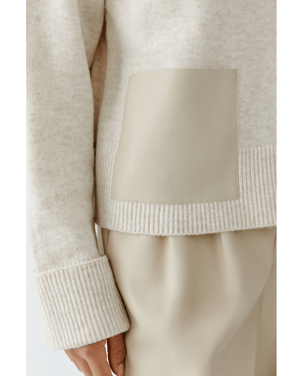 Deze pullover in light beige mel is een warme, moderne trui met verfijnde details. De leerlook accenten en het grote zakje met logo geven dit casual ontwerp een eigentijdse uitstraling.
