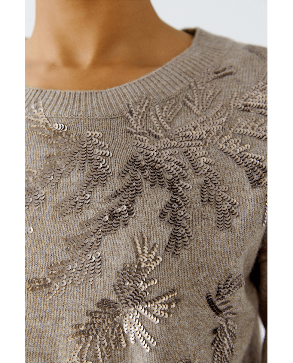 Deze pullover in smokey taupe combineert casual comfort met een subtiele sprankeling. De korte lengte en losse pasvorm geven een moderne look, terwijl de paillettenmotieven een verfijnde twist toevoegen.