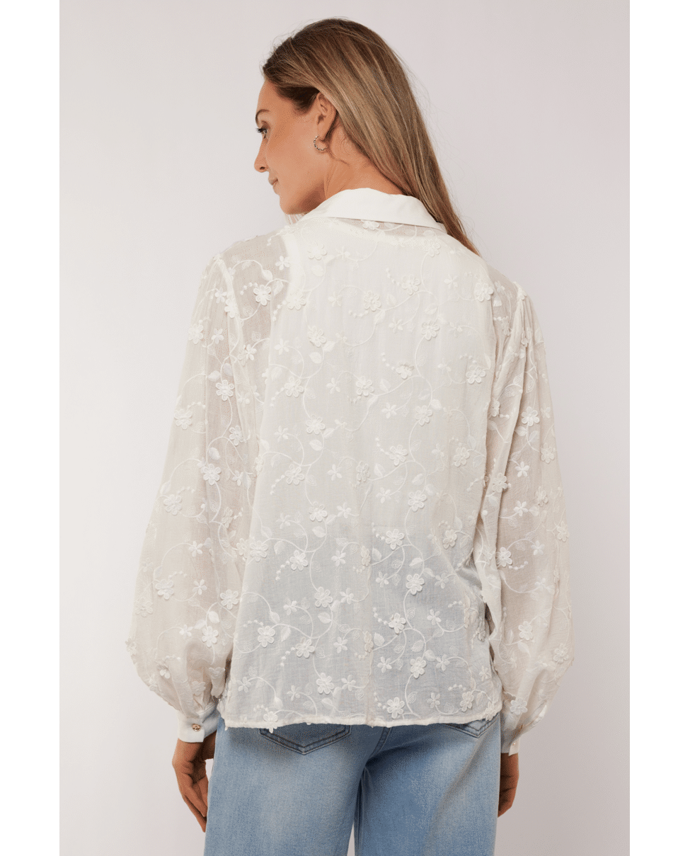 De luchtige stof en fijne bloemenstructuur geven elke outfit een dromerige touch. Mooi op denim of een linnen broek.
