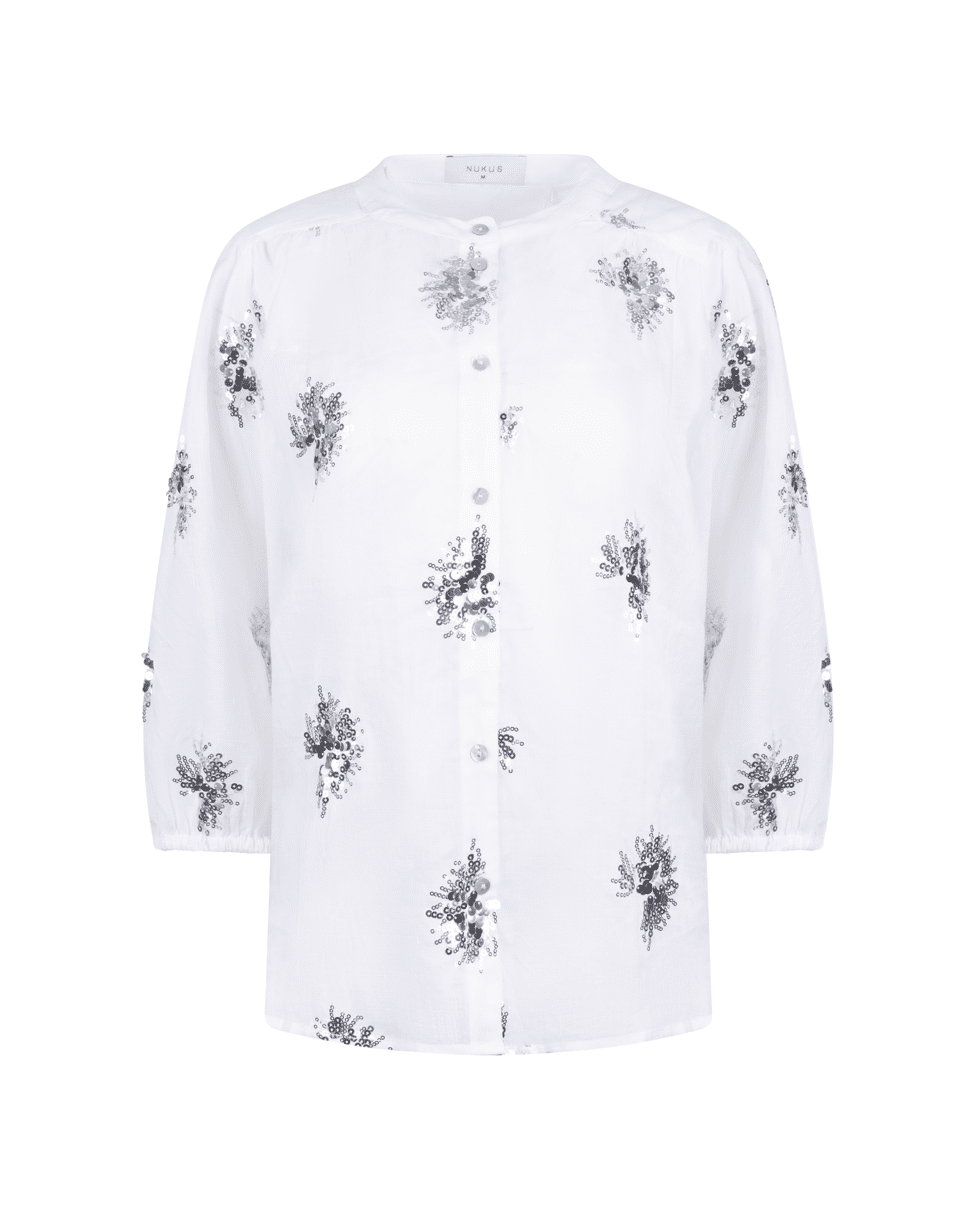 De handgestikte pailletten geven de blouse een unieke, ambachtelijke look – subtiel fonkelend in het licht.