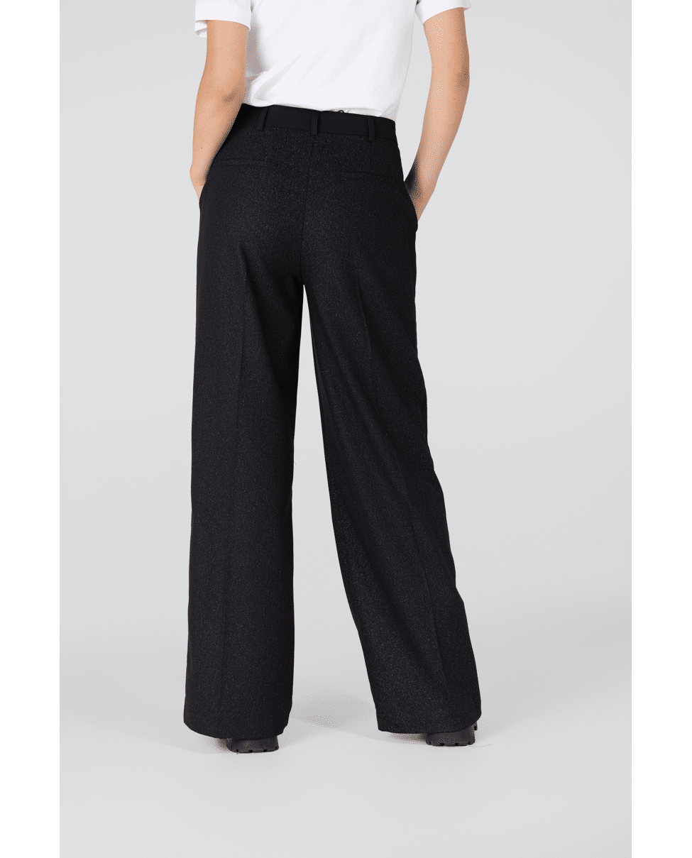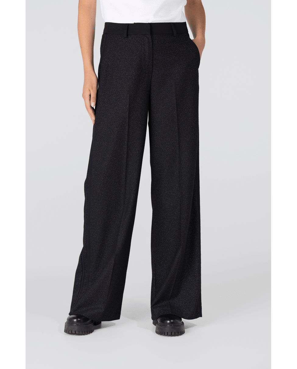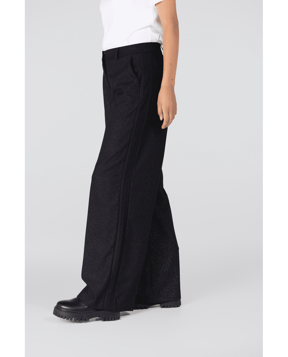 Voor een stijlvolle twist op je everyday look. Deze zwarte damesbroek van Jansen heeft een subtiele glitter, rechte wijde pijpen en een ton-sur-ton zijstreep. Ideaal voor feestelijke momenten of een chique casual outfit.