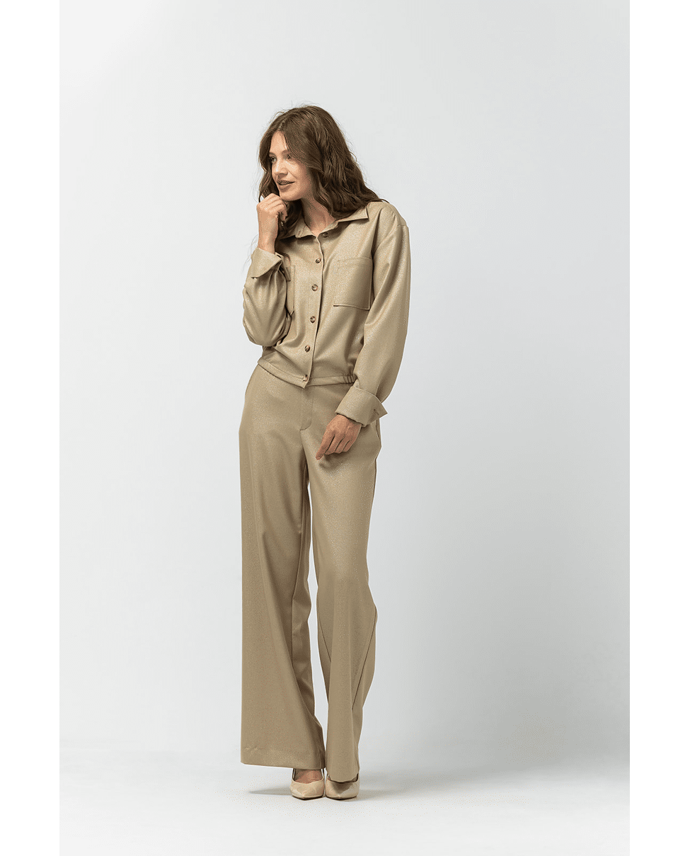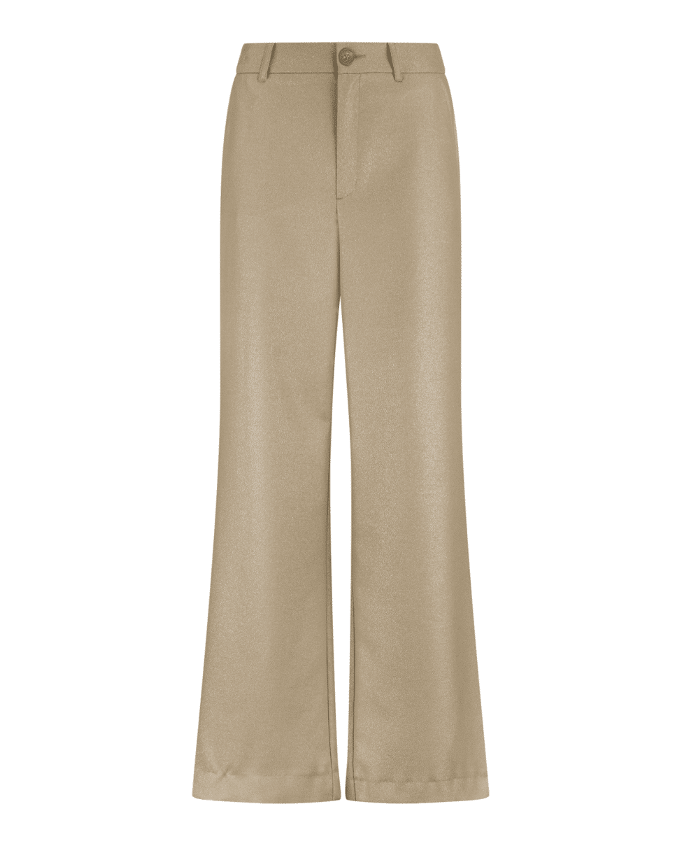 De glinsterende stof in combinatie met de wijde pijpen zorgt voor een elegante, zelfverzekerde uitstraling. Comfortabel dankzij de elastische tailleband achter.