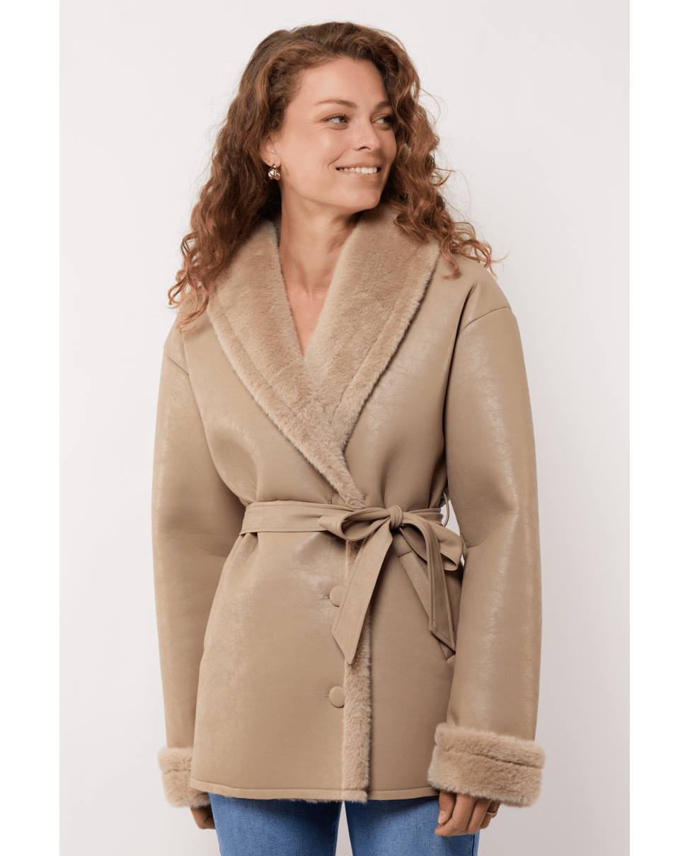 Tyra coat – Zacht sherpa damesjas van G-maxx met imitatieleer, strikceintuur, steekzakken, reverskraag en knoopsluiting