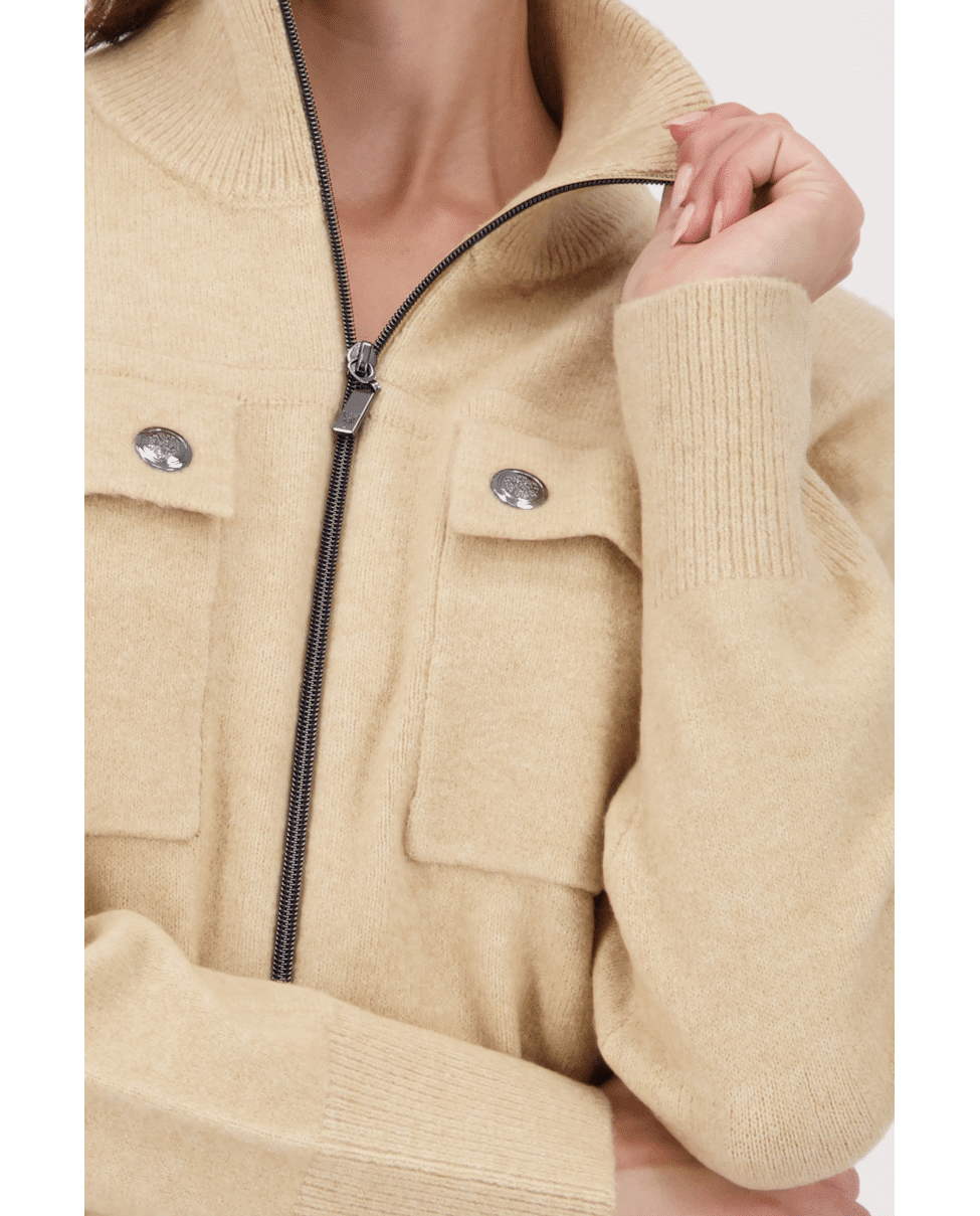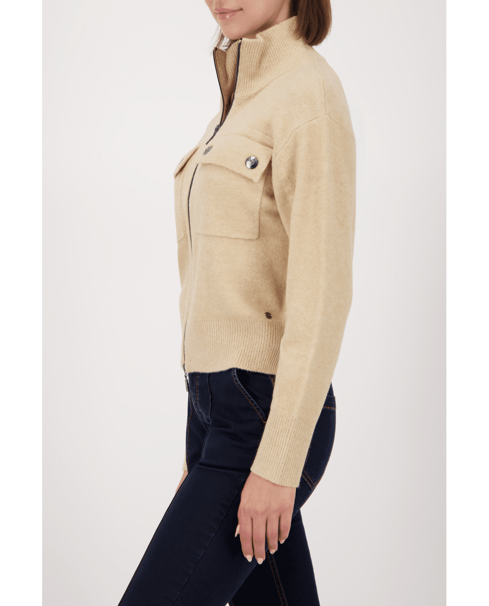 Kort gebreid damesjasje van Monari met klepzakken, ritssluiting, opstaande kraag en lange mouwen
