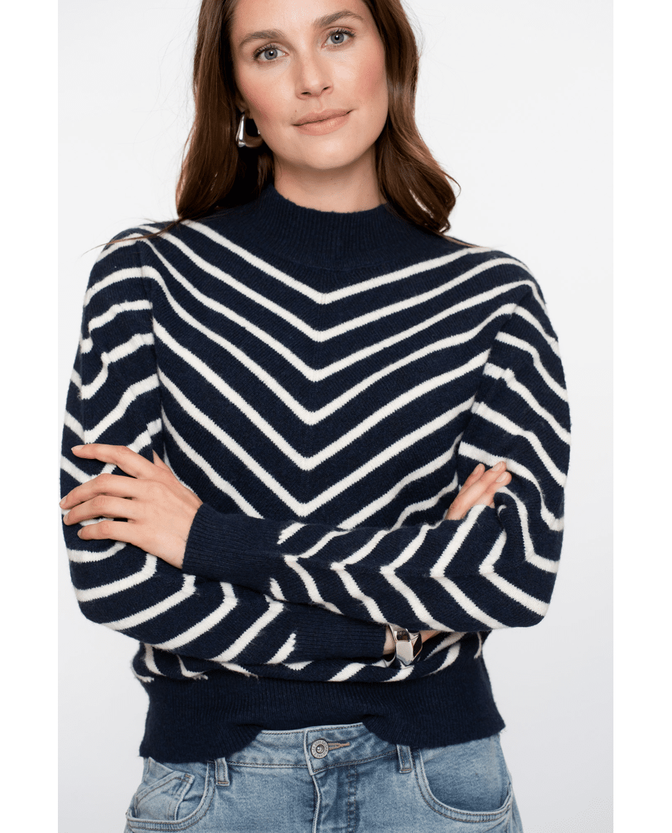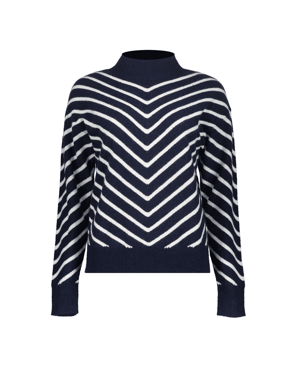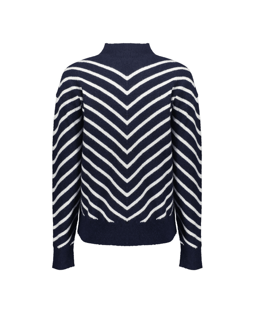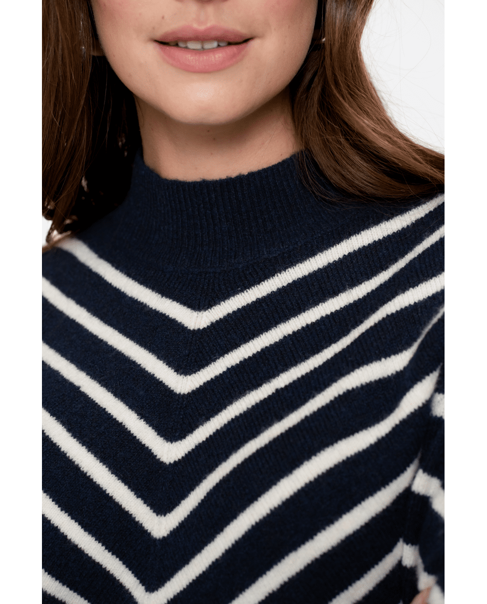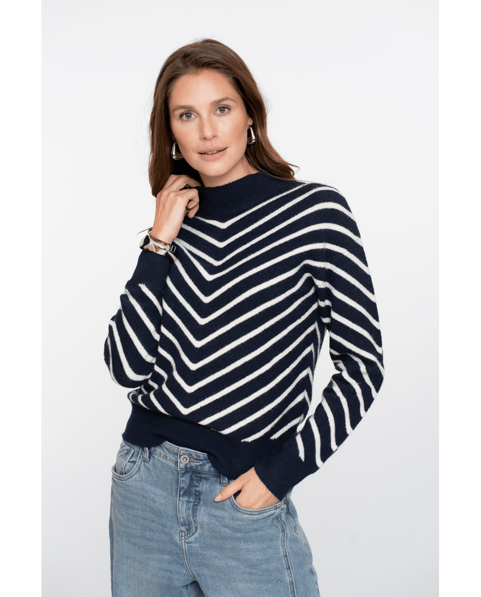 Een gestreepte pullover met turtleneck die warmte en stijl combineert. De navy-witte strepen geven deze trui een frisse, tijdloze uitstraling.