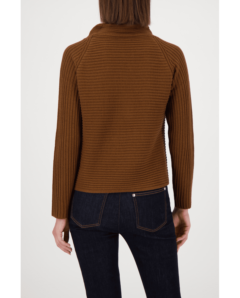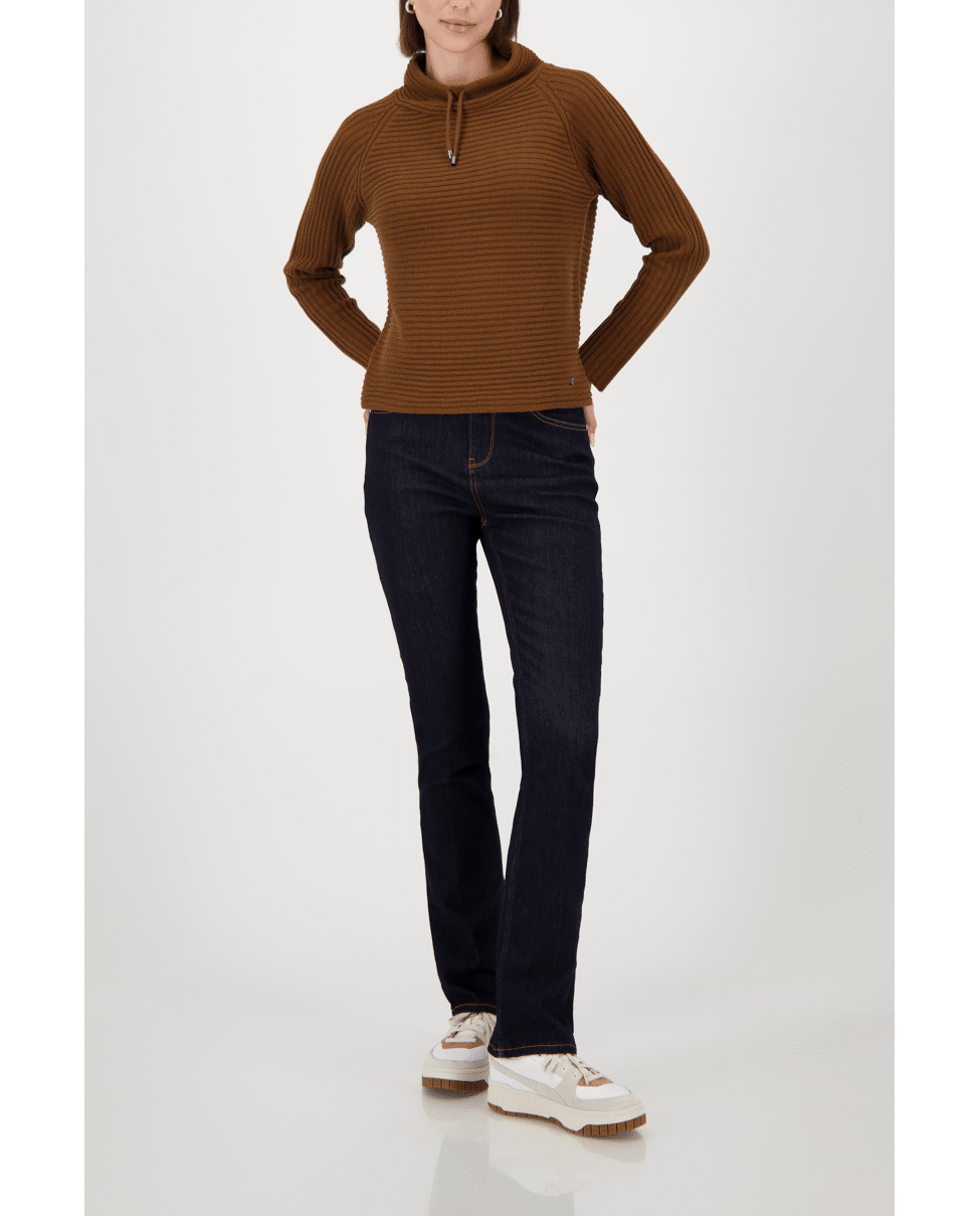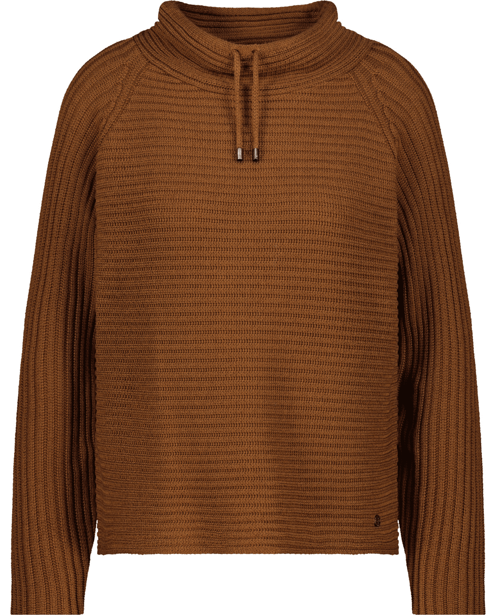 Gebreide dames trui van Monari met opstaande kraag met trekkoord en lange mouwen