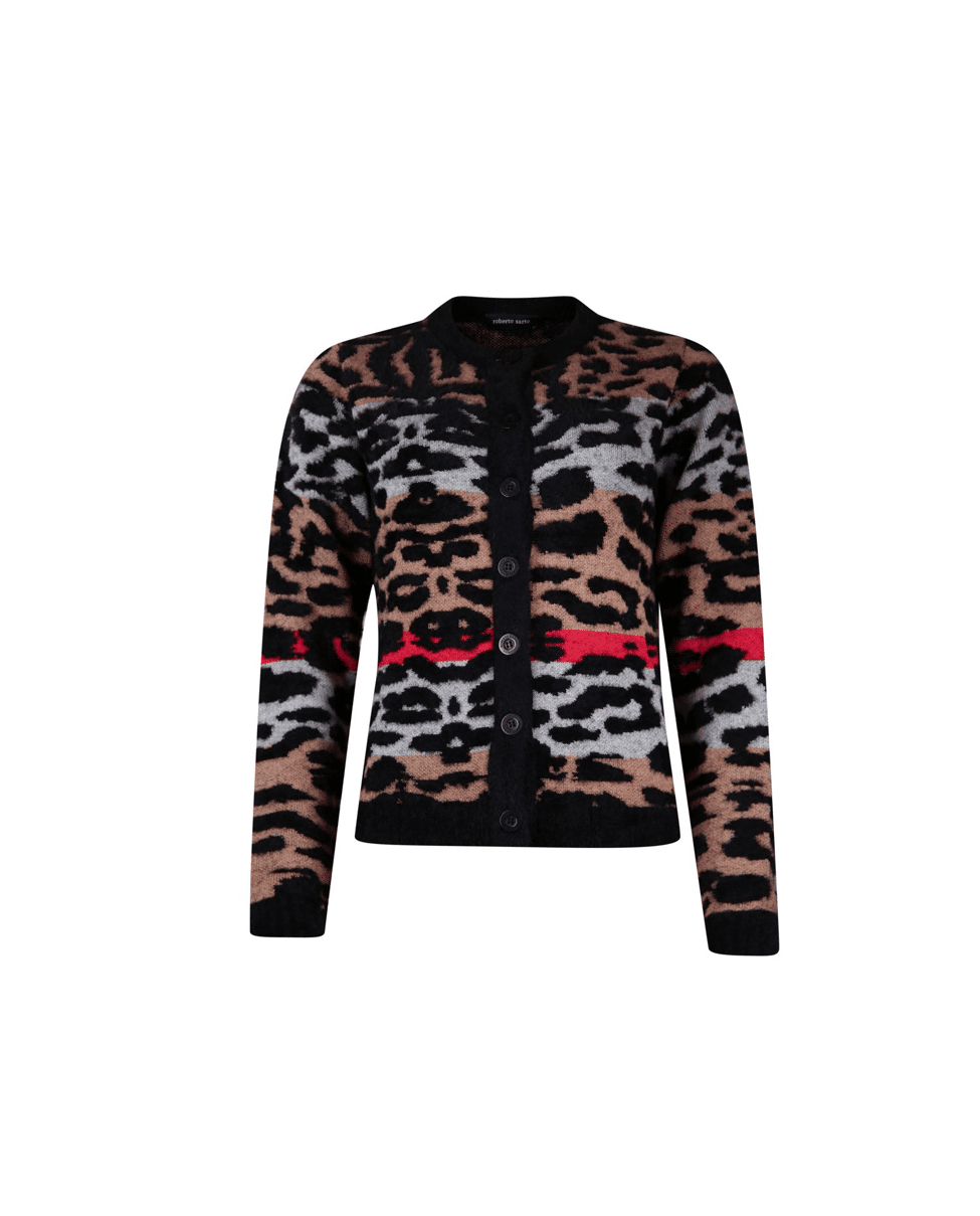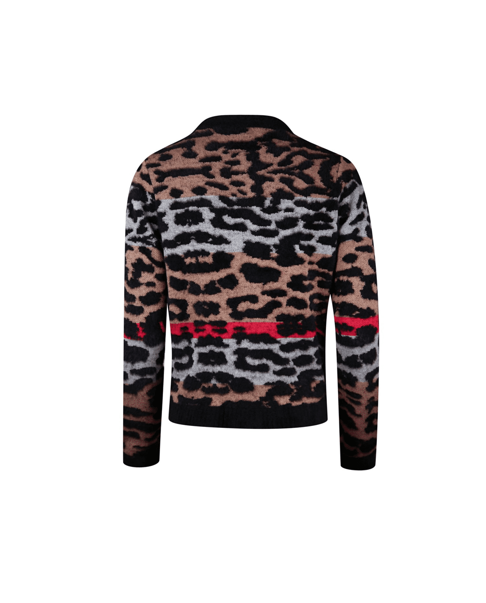 Gedessineerd vest met ronde hals in een opvallende panterstreep. Gemaakt van zacht harig chenille garen in warme camel-, rood- en zwarttinten. Perfect voor koude dagen met een vleug lef.