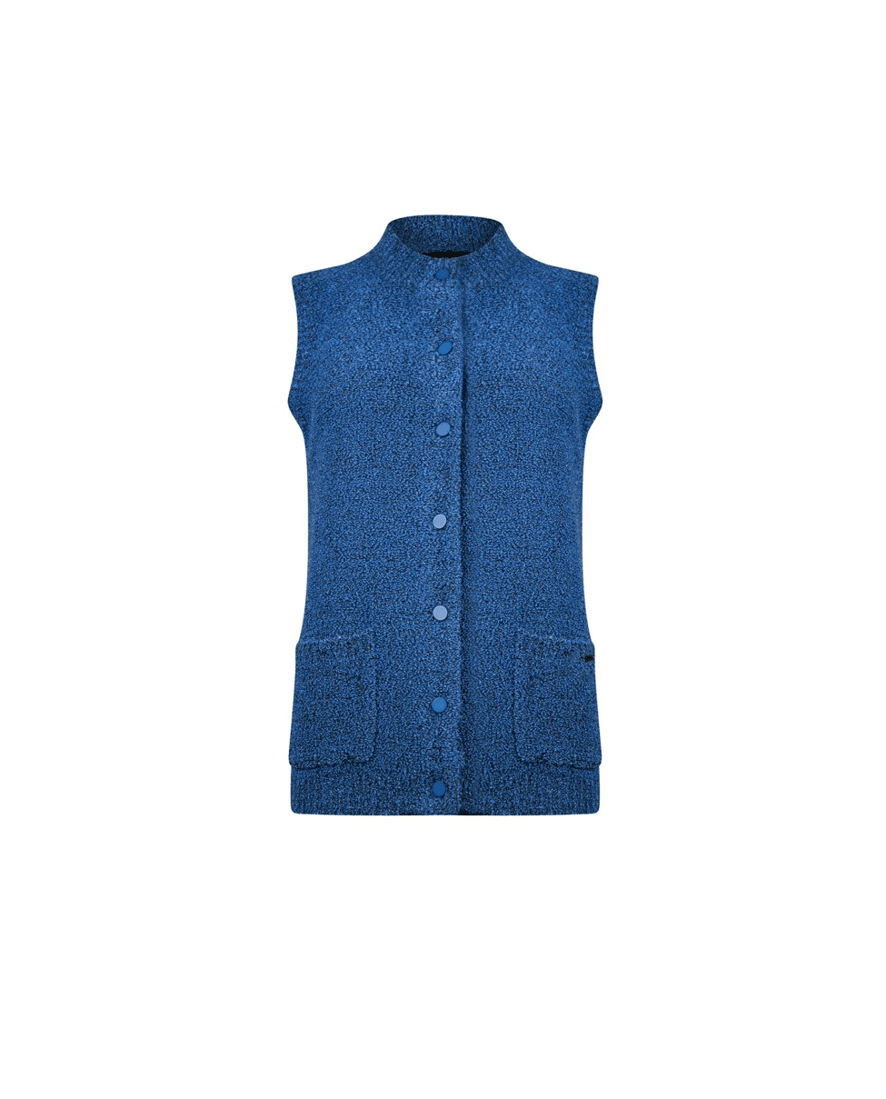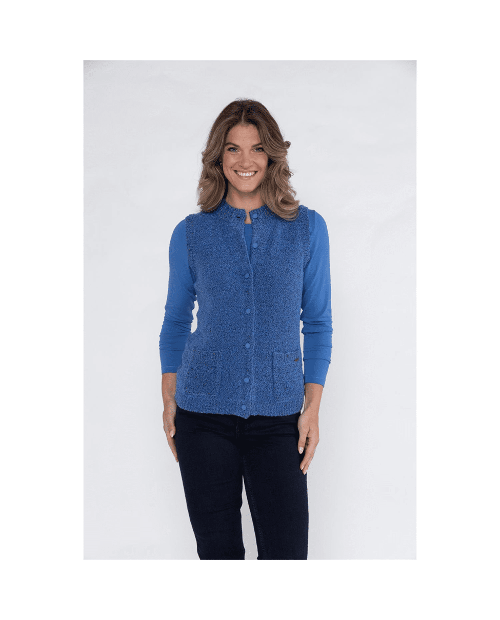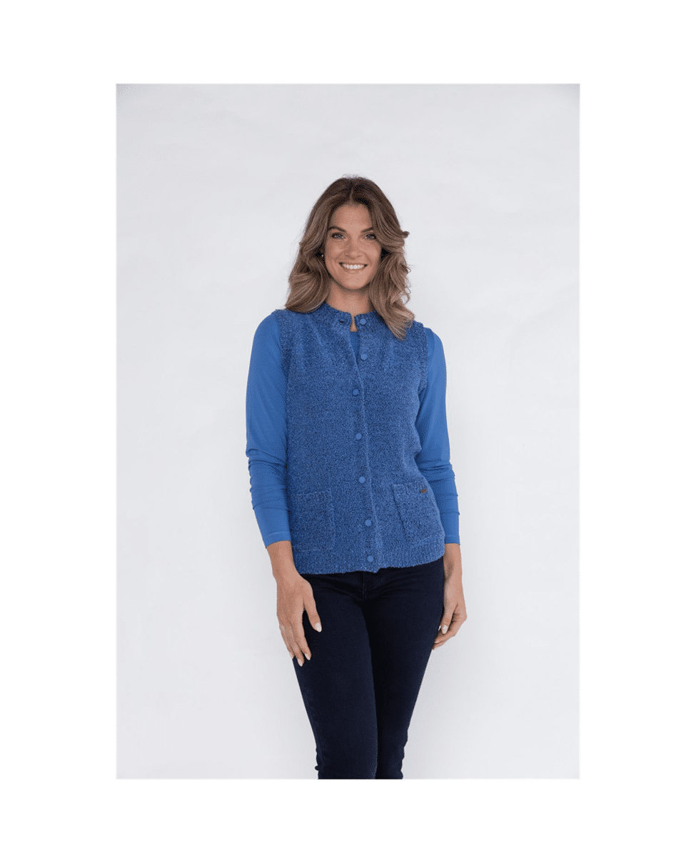 Een modern mouwloos vest in Dutch blue, gebreid van zacht bouclé garen. Dit eigentijdse gilet is veelzijdig te dragen en voegt direct textuur en stijl toe aan je outfit.