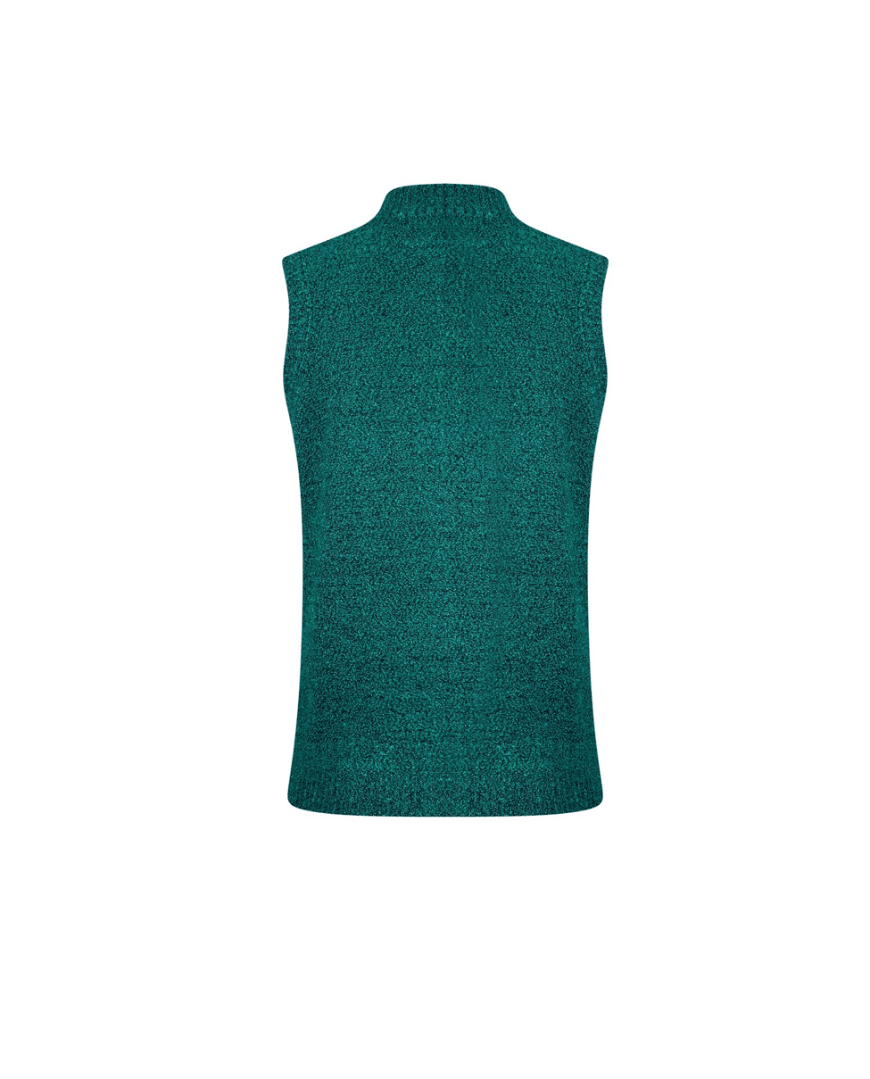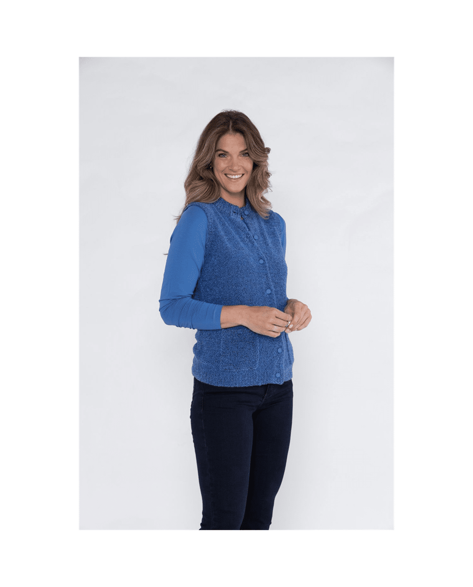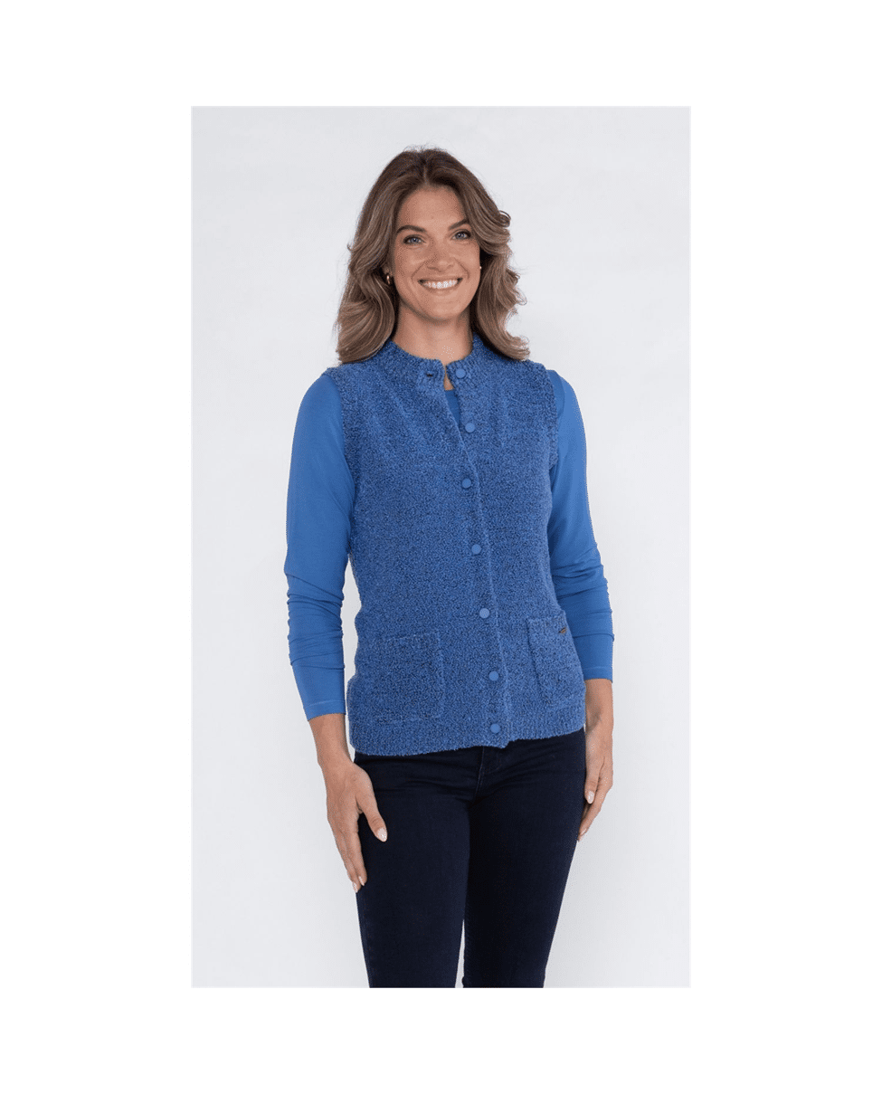Een modern mouwloos vest in Dutch blue, gebreid van zacht bouclé garen. Dit eigentijdse gilet is veelzijdig te dragen en voegt direct textuur en stijl toe aan je outfit.