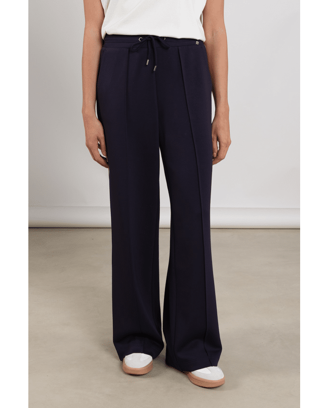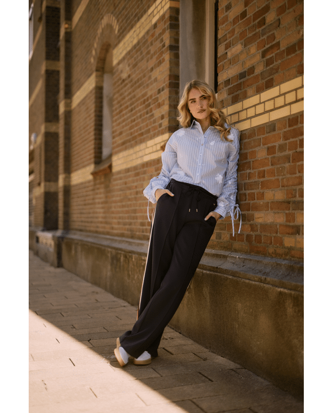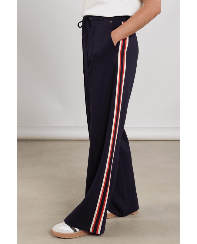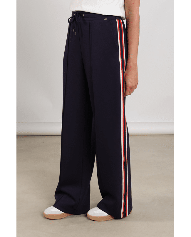 Sportief met een vrouwelijke twist. De Nora Pants is een navy broek met een flatterende fit en opvallende zijstrepen. Perfect voor casual dagen of een relaxte work-from-home look.