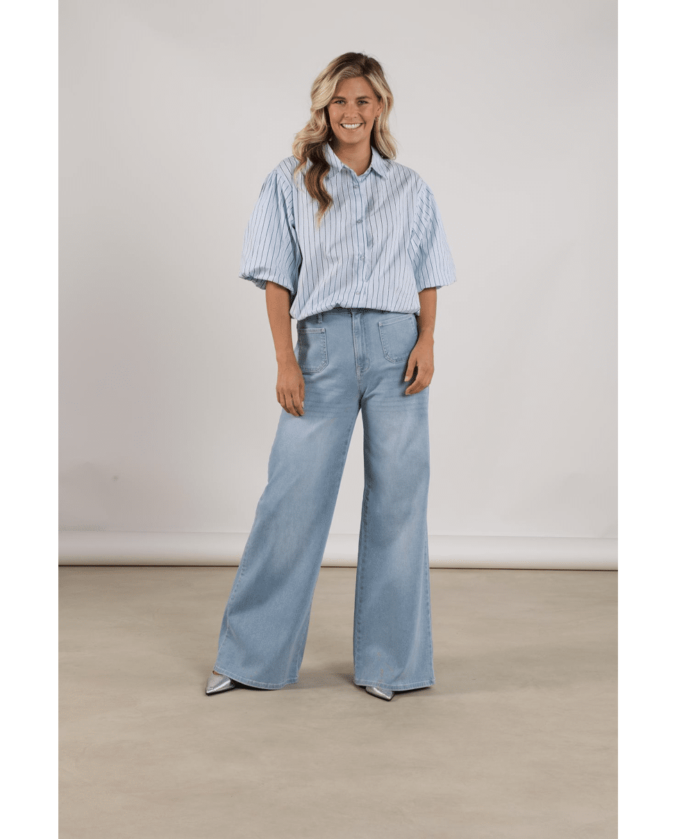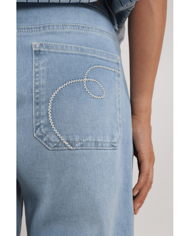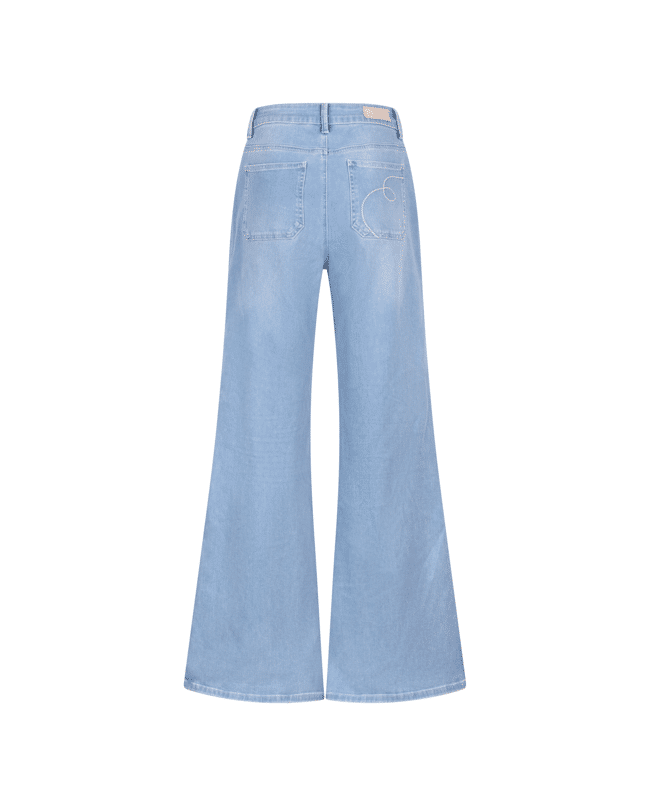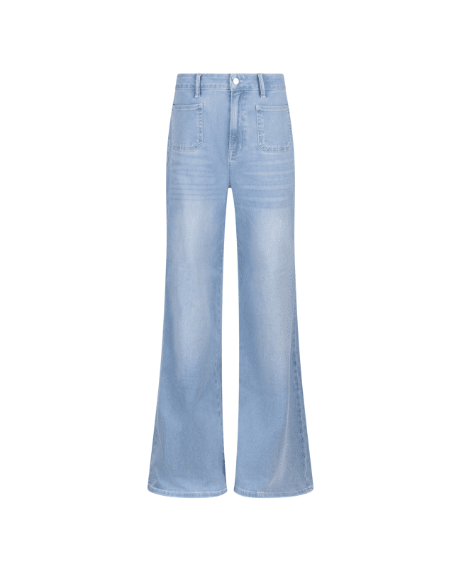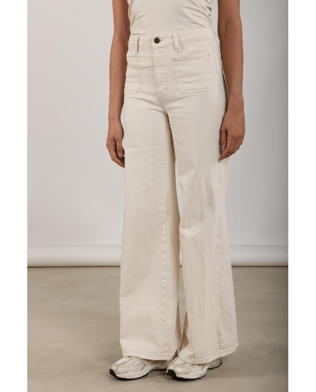 Deze flared jeans combineert een retro vibe met modern comfort. Verkrijgbaar in verfrissend lichtblauw en tijdloos off white – ideaal voor zonnige dagen.