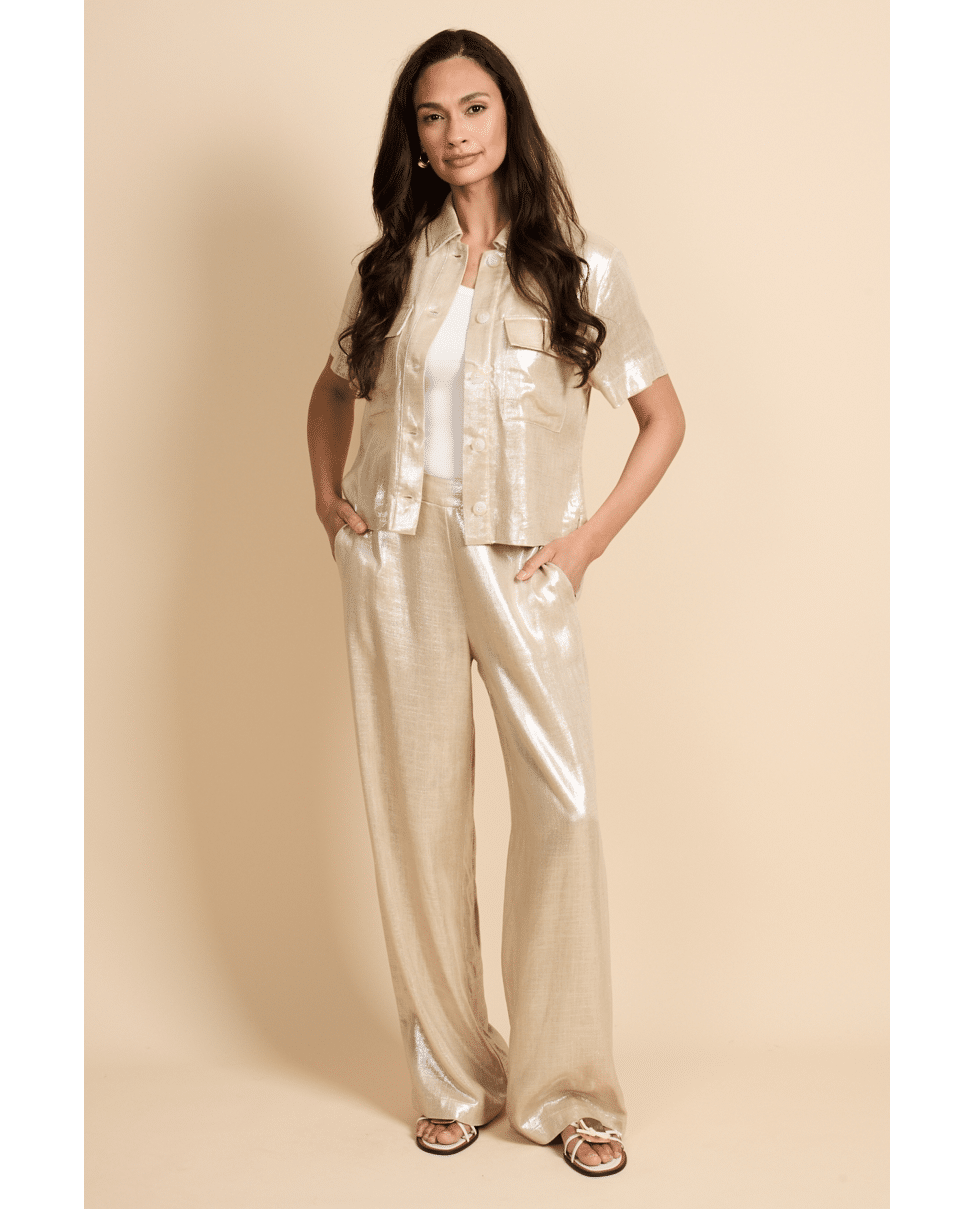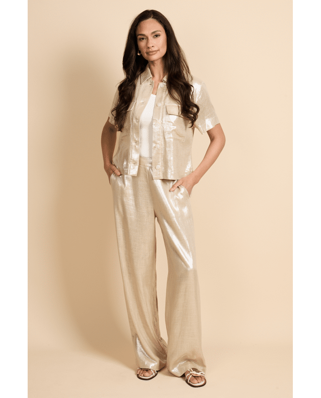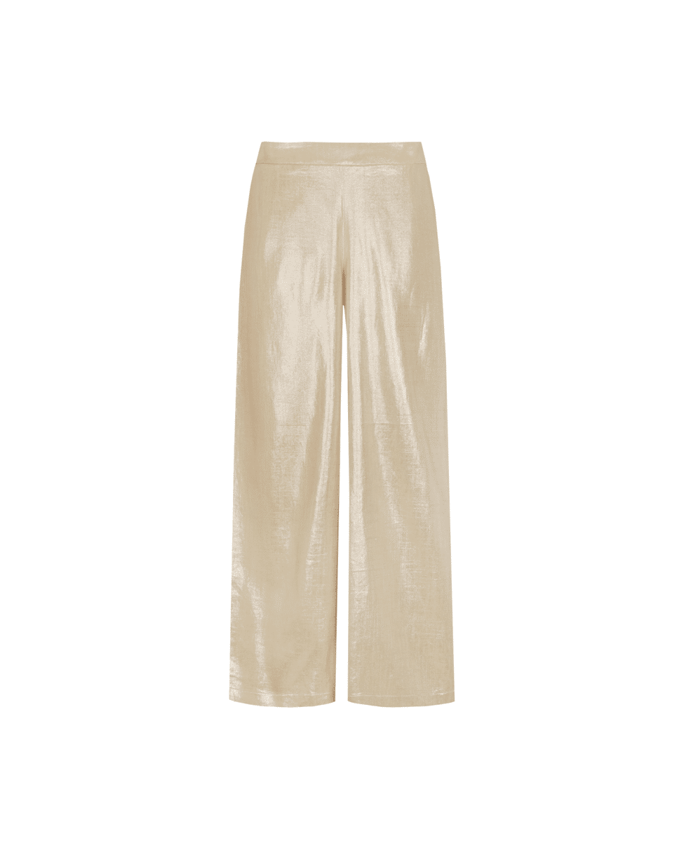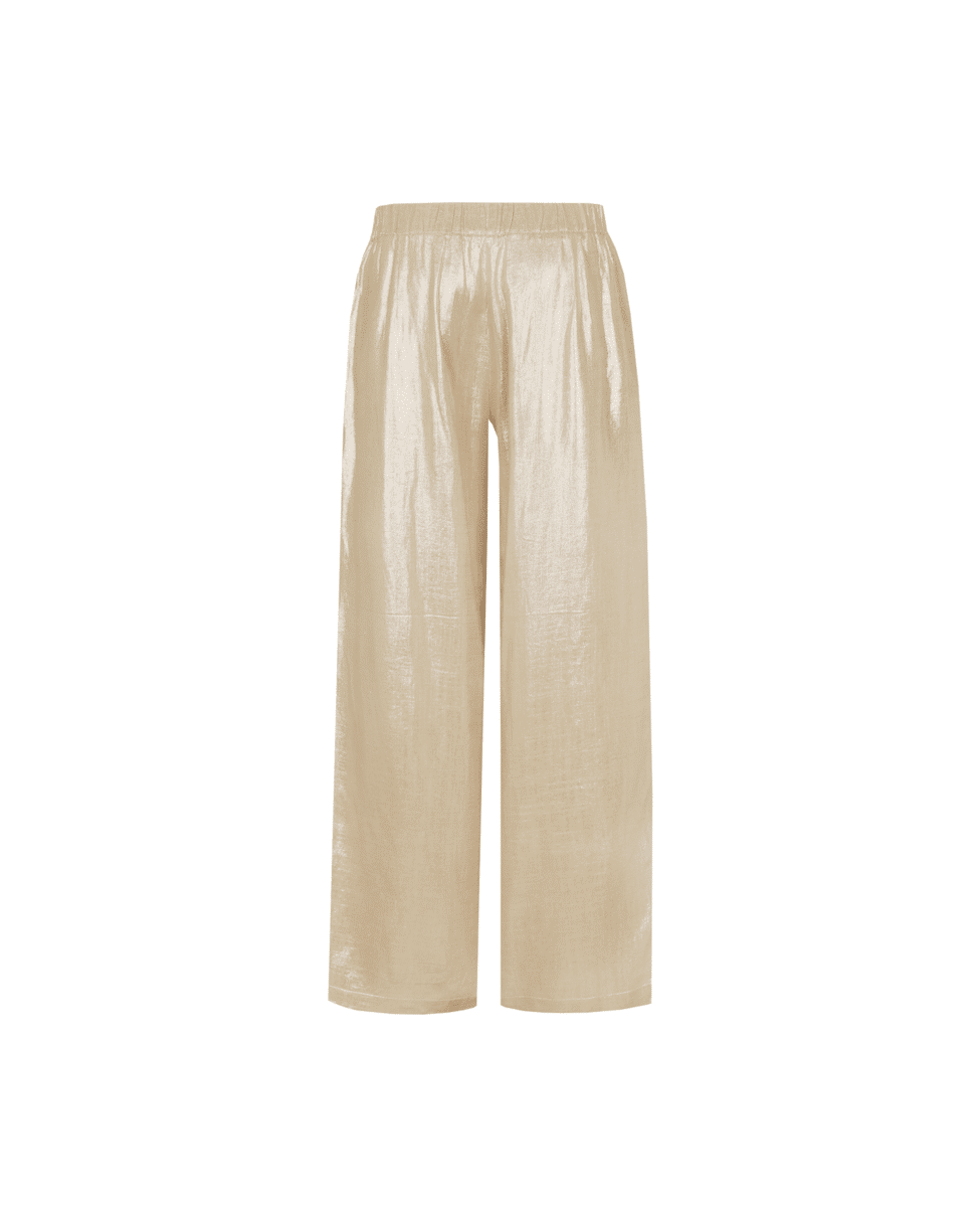 De Noeline broek is de perfecte mix van comfort en elegantie. Dankzij de hoge taille met elastische band en de soepel vallende, wijde pijpen creëert deze broek een flatterend silhouet. De licht glanze
