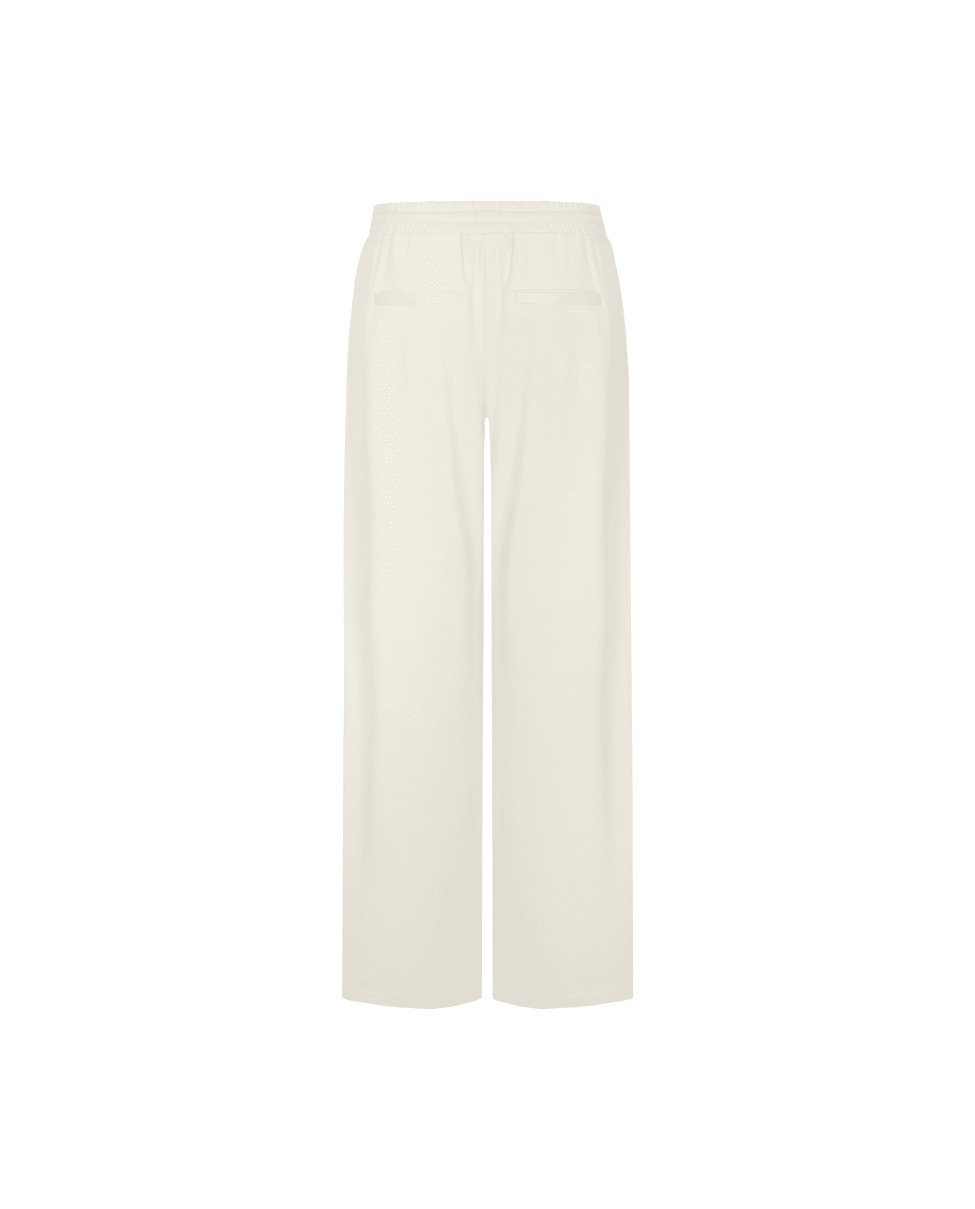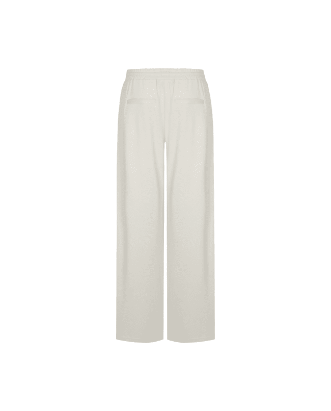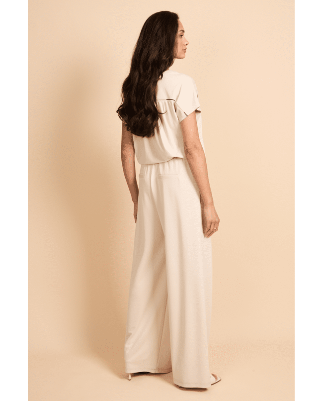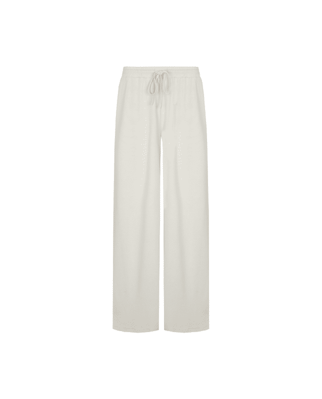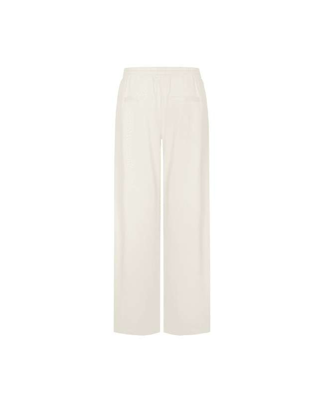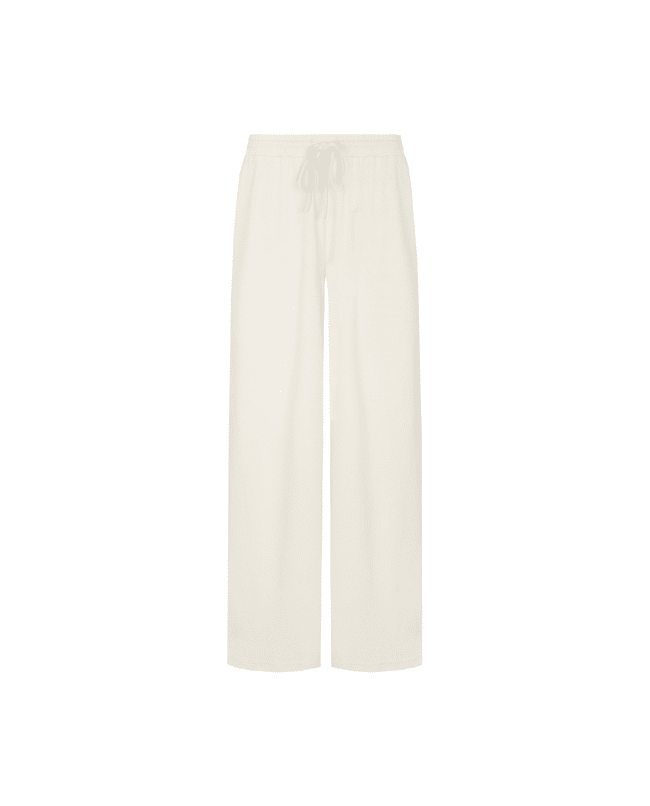 De Romyne broek is een elegante broek met een moderne, ontspannen uitstraling. Het model heeft een hoge taille met elastische band en strikdetail en valt in een wijde, rechte pasvorm langs het been. D