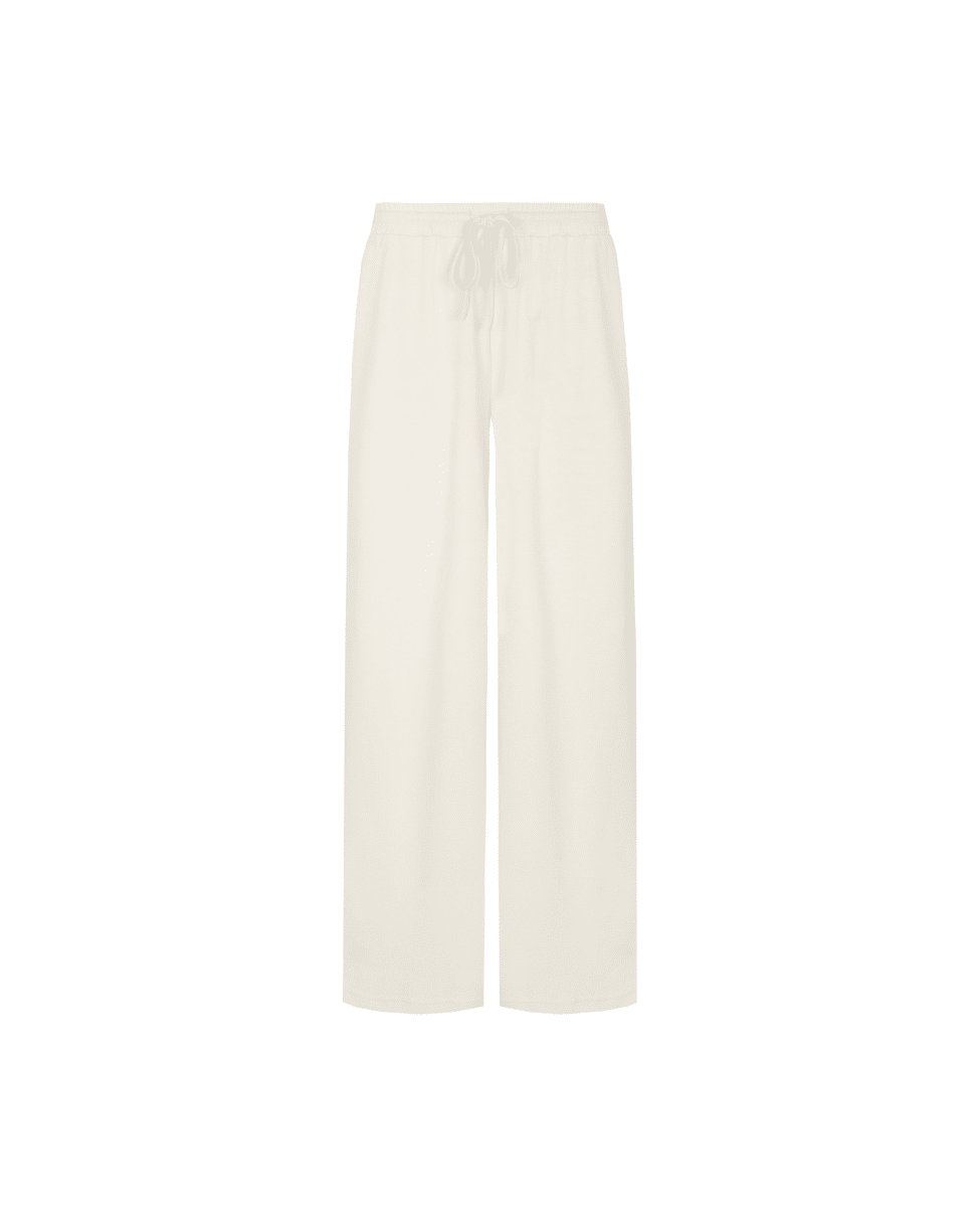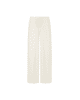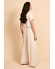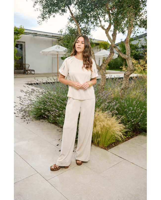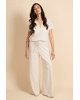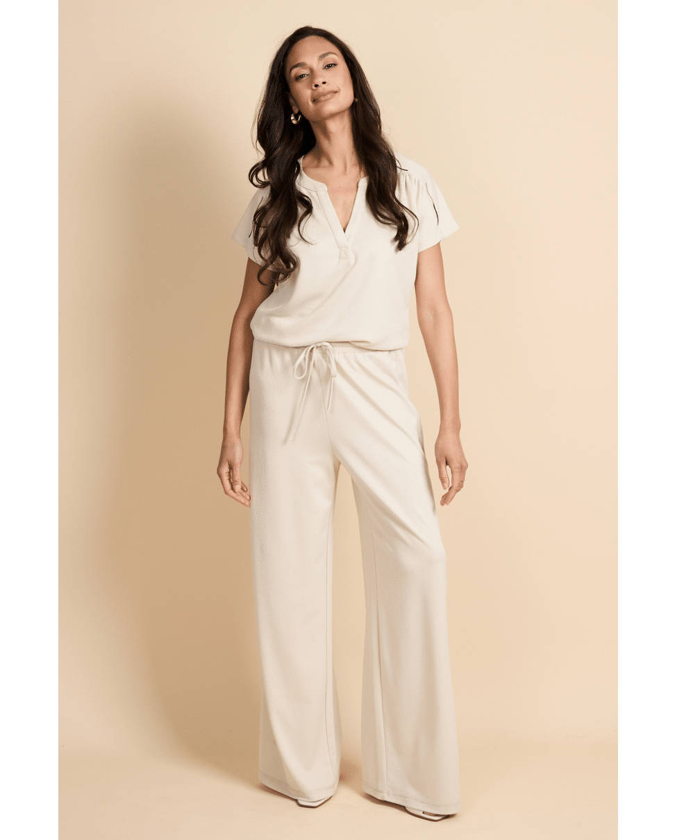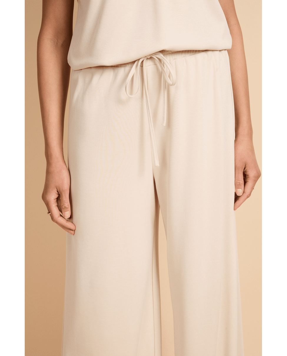 De Romyne broek is een elegante broek met een moderne, ontspannen uitstraling. Het model heeft een hoge taille met elastische band en strikdetail en valt in een wijde, rechte pasvorm langs het been. D