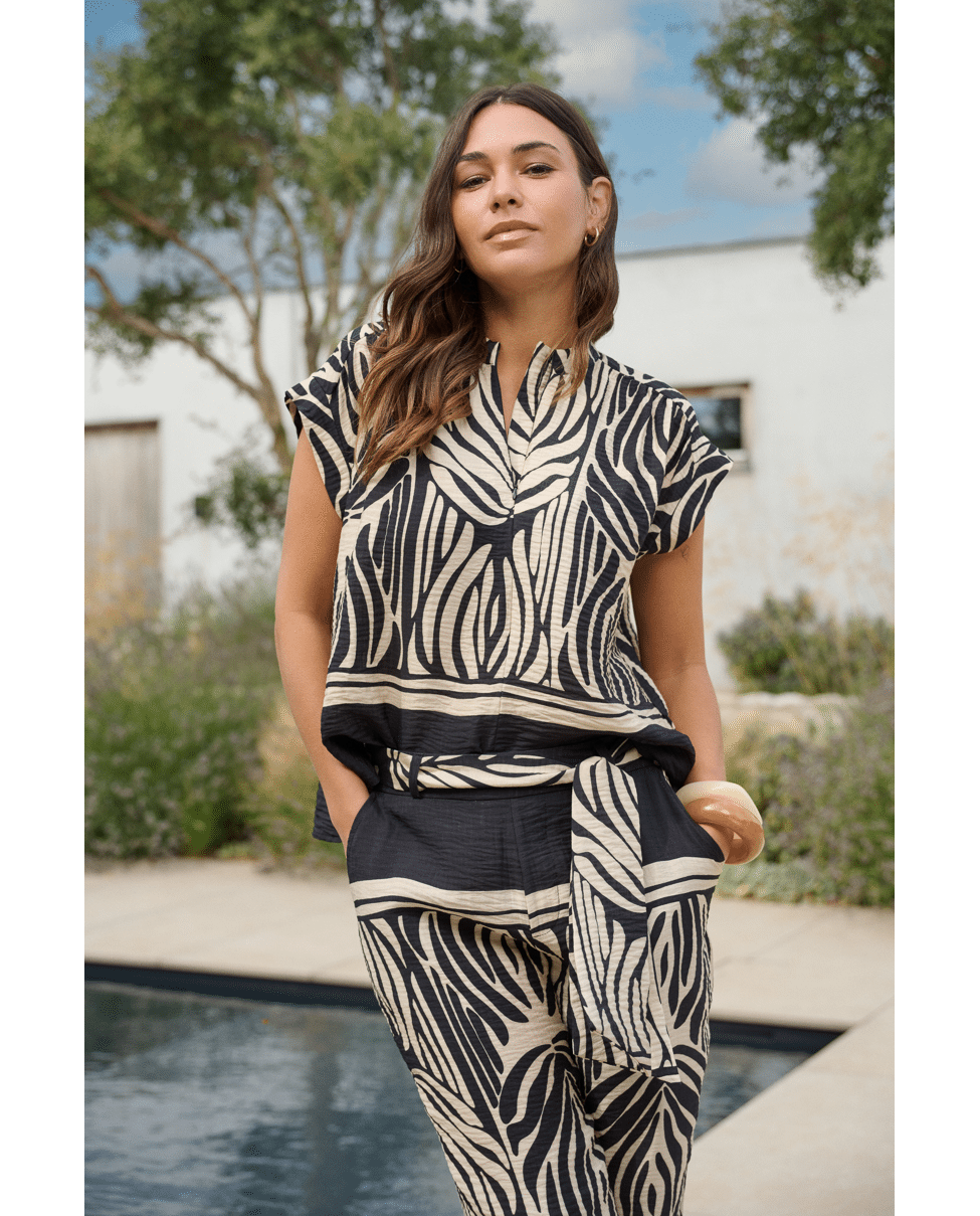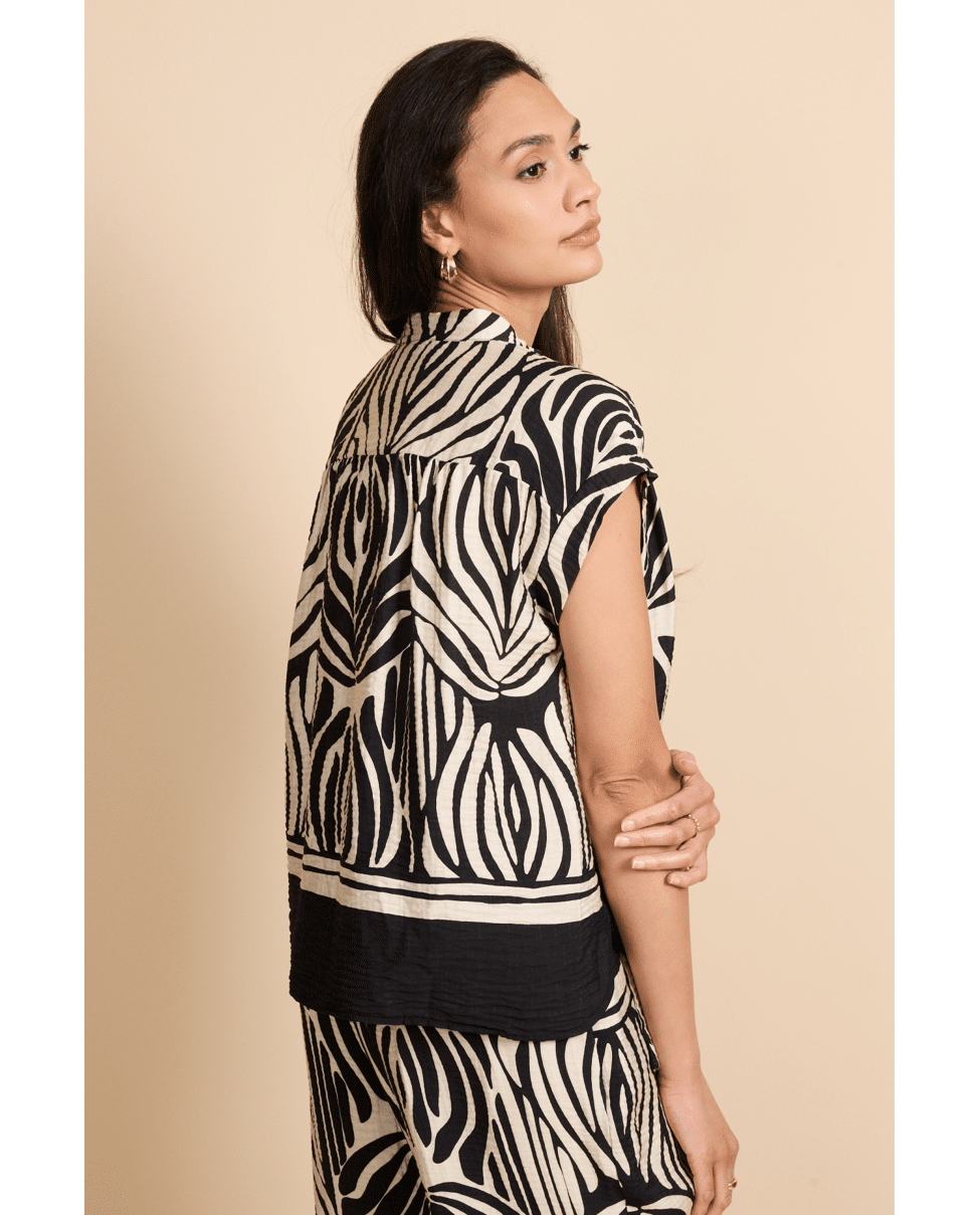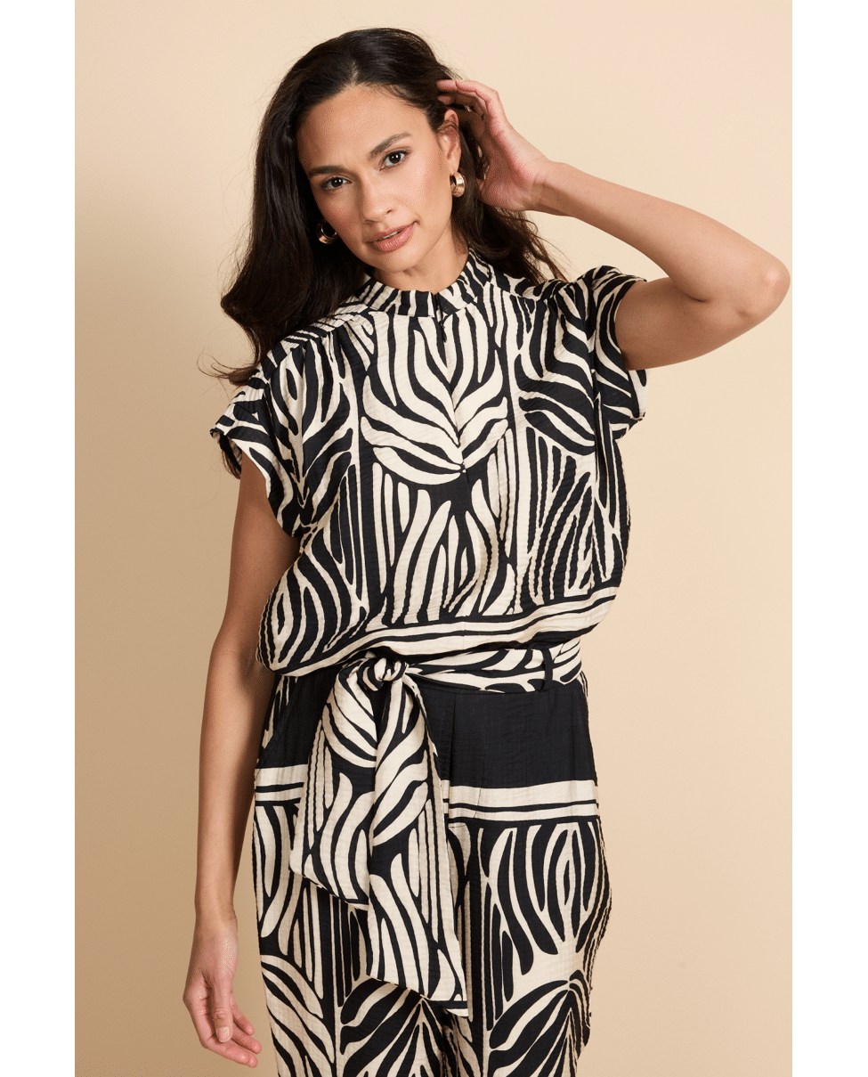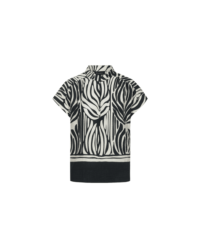 De Havine top is een echte blikvanger met een krachtig grafisch dessin. Het model heeft een subtiele opstaande hals en korte mouwen, wat zorgt voor een moderne en elegante uitstraling. De soepelvallen