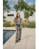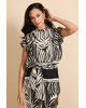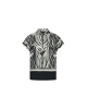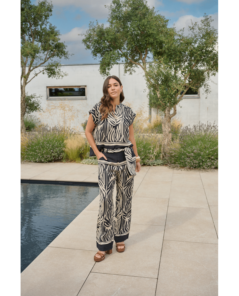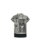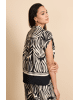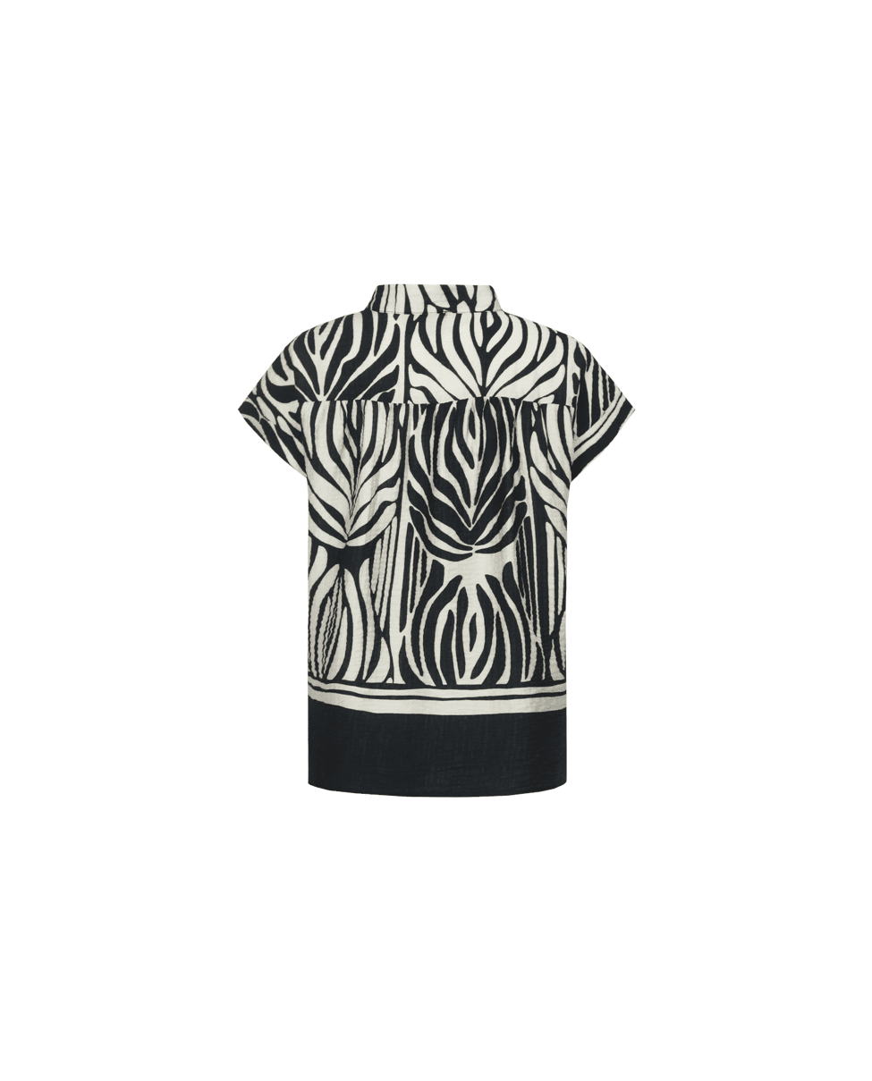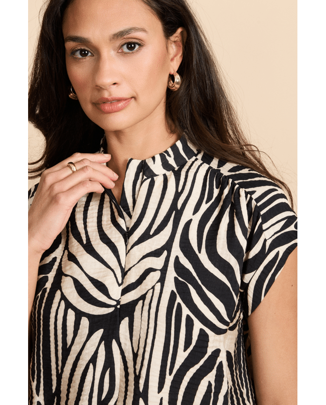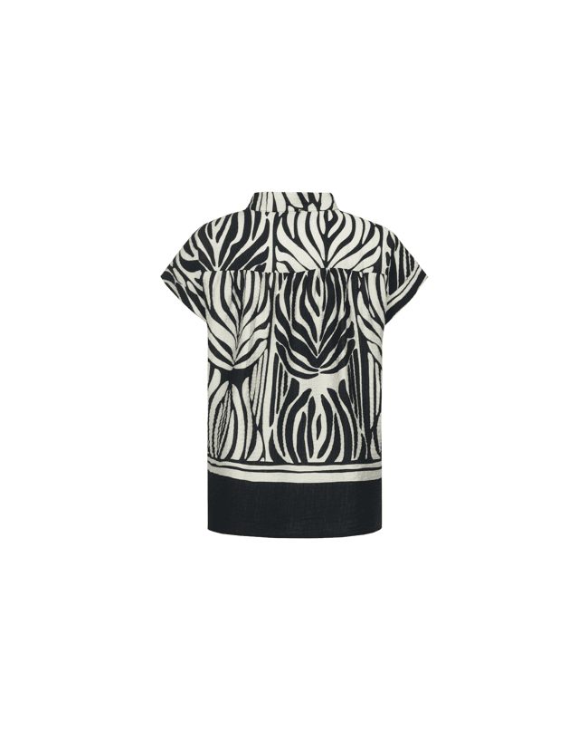 De Havine top is een echte blikvanger met een krachtig grafisch dessin. Het model heeft een subtiele opstaande hals en korte mouwen, wat zorgt voor een moderne en elegante uitstraling. De soepelvallen