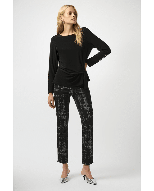 Deze 7/8 slim fit broek van Joseph Ribkoff heeft een moderne grafische print en een brede tailleband. Het model combineert stijl met comfort – ideaal voor een verzorgde look.