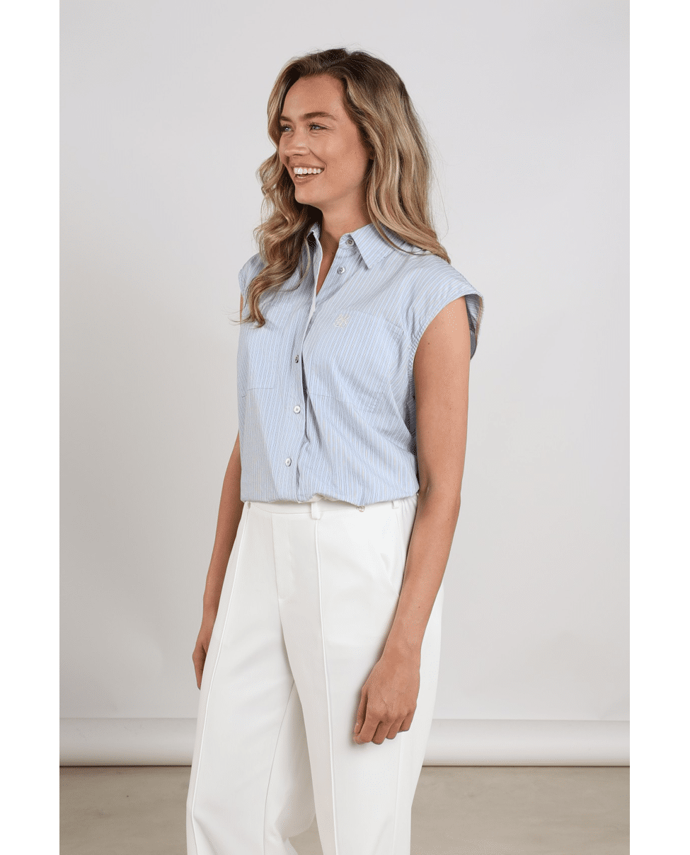 Deze luchtige blouse met klassiek kraagje en sportieve streep is perfect voor zonnige dagen. Licht, comfortabel en modern afgewerkt.