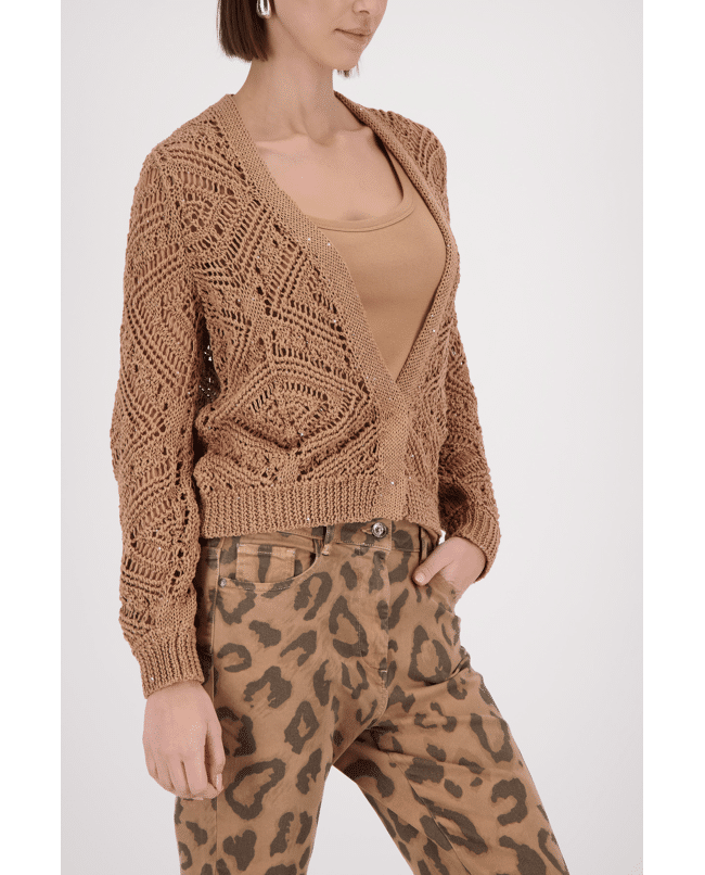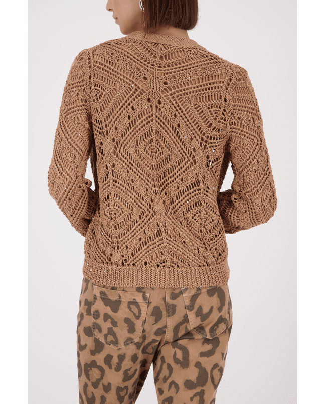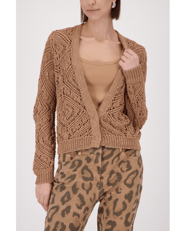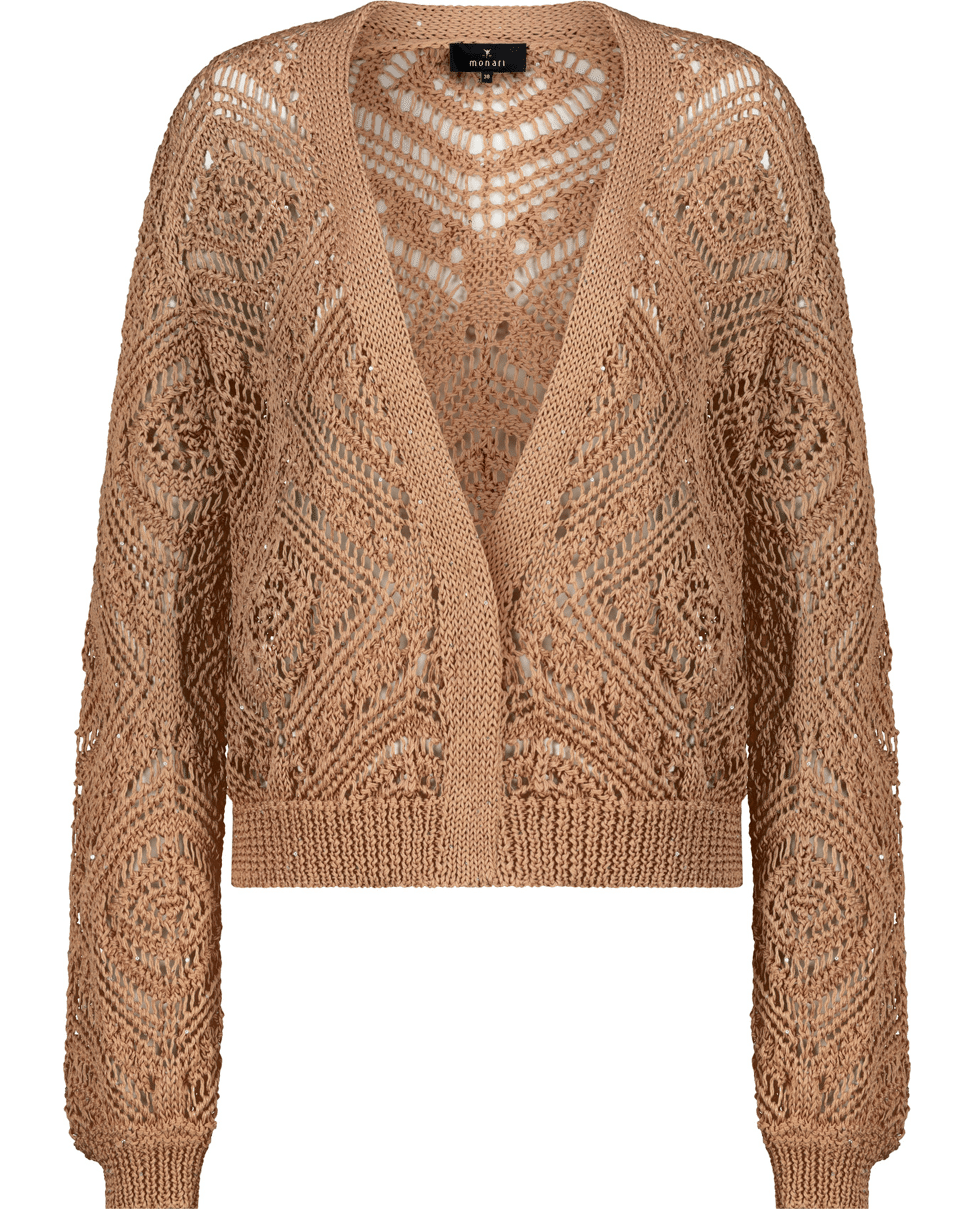 Ajour gebreid damesvest van Monari met opengewerkt patroon, glitterdetails en lange mouwen