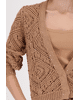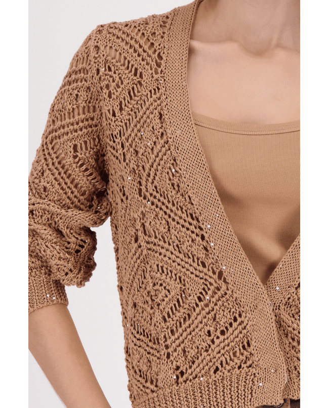 Het verfijnde ajour breisel zorgt voor een speels effect zonder druk te ogen. Een fijn bruin vest dat net dat beetje extra textuur en stijl toevoegt aan je look.