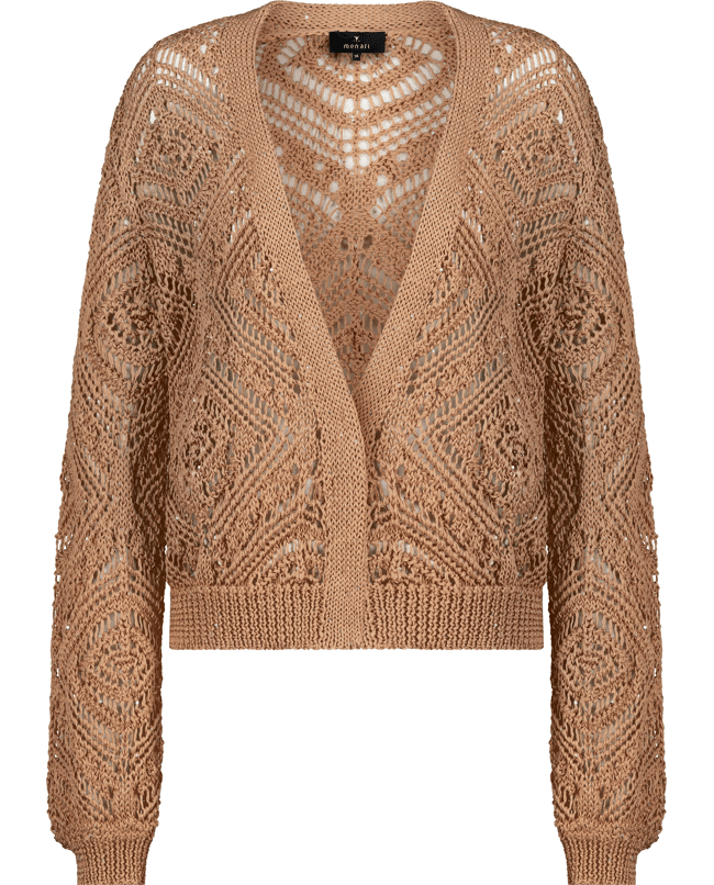 Dit ajour vest voor dames uit de monari lente/zomer 2026 collectie is luchtig, vrouwelijk en makkelijk te combineren. De warme tint en het opengewerkte patroon geven je outfit direct een zachte, zomerse uitstraling. Perfect over een top of jurk op frisse lentedagen.