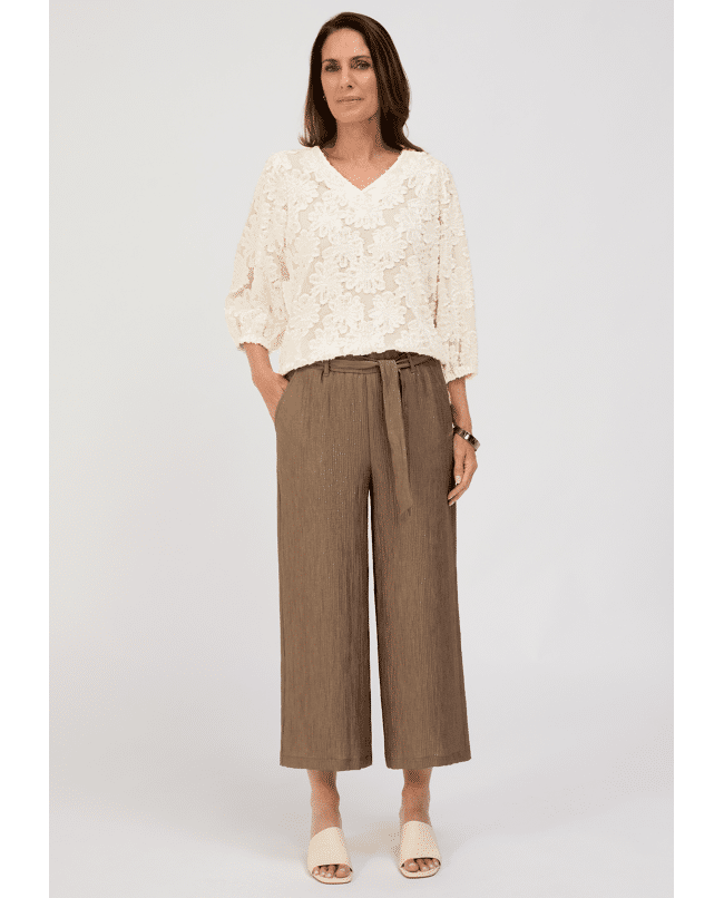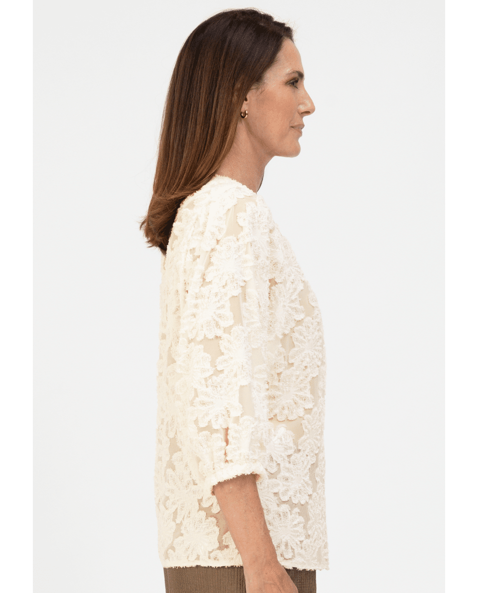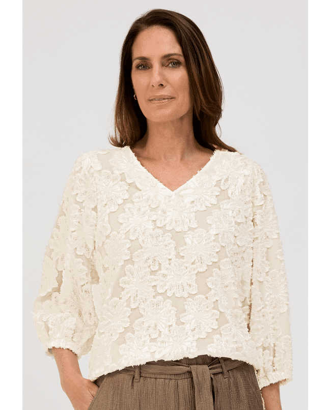 De ALENA dames top van BIANCA is een verfijnde keuze voor het voorjaar. Het subtiele bloemenpatroon in zachte wittinten geeft deze witte damesblouse met V-hals een rustige, elegante uitstraling. Mooi op een lichte pantalon of gecombineerd met denim.
