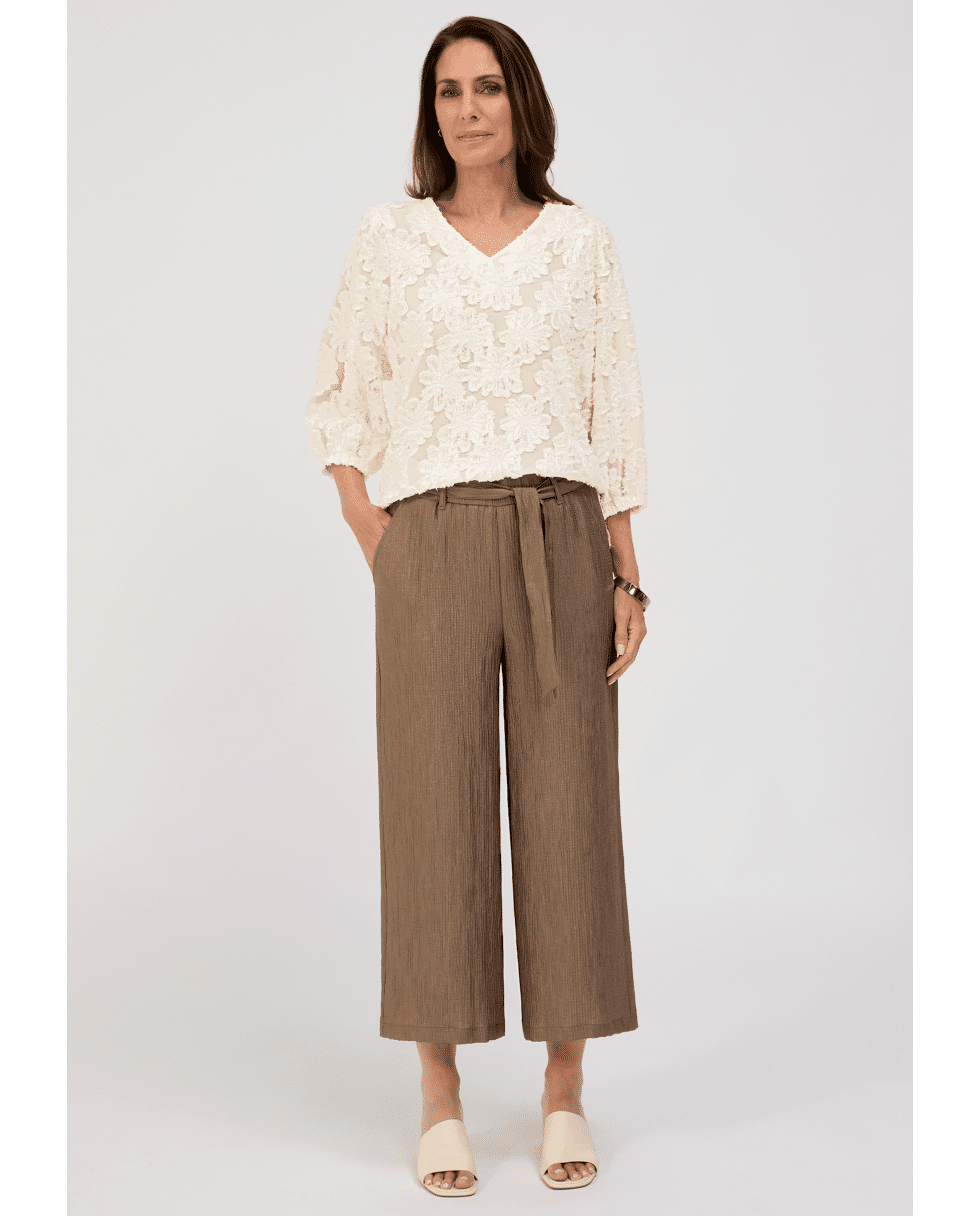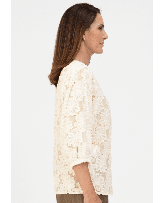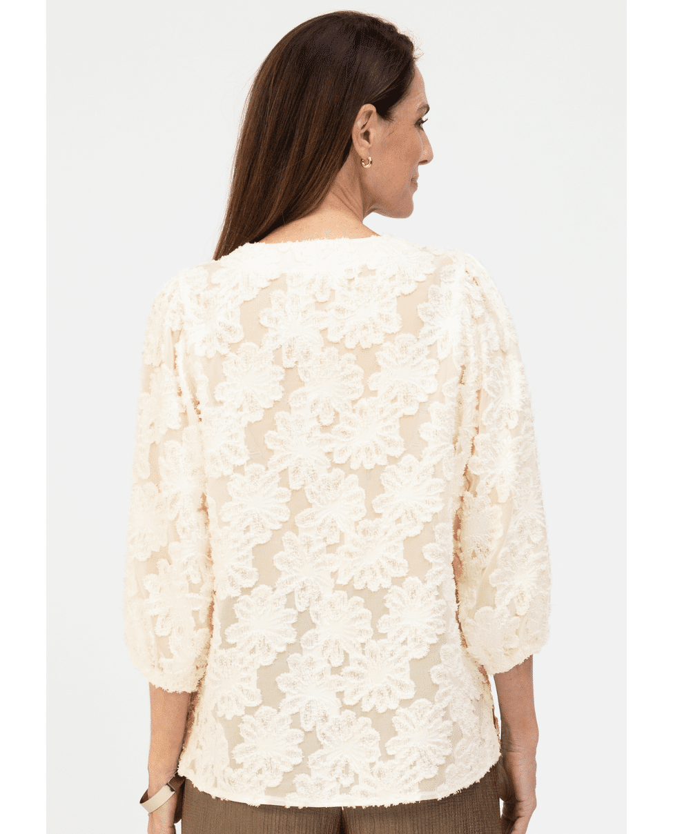 De ton-sur-ton bloemenprint oogt chic zonder druk te zijn. De 3/4 mouwen met lichte pof zorgen voor een vrouwelijke, zachte lijn.