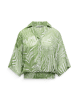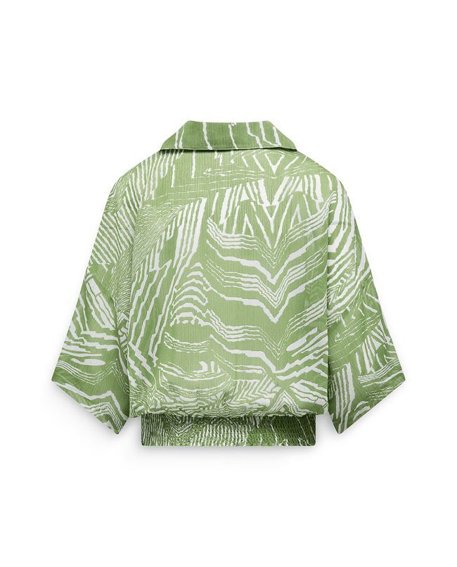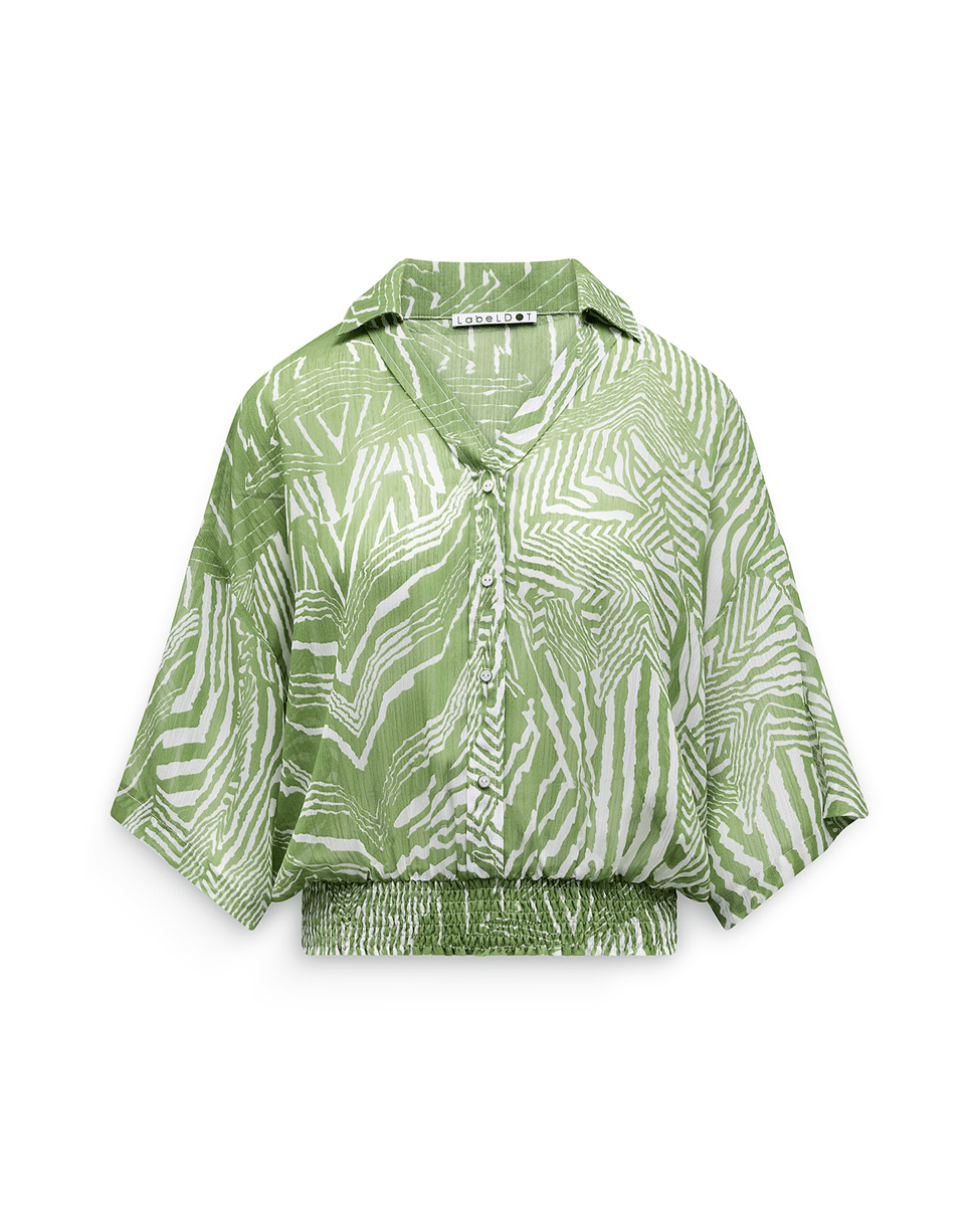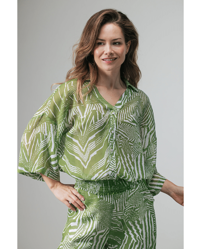 Deze groen-witte blouse met grafische print is een frisse eyecatcher voor het lente- en zomerseizoen. De luchtige crêpestof en elastische smockzoom zorgen voor comfort én een mooi silhouet, perfect voor zowel casual als geklede momenten.