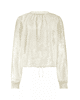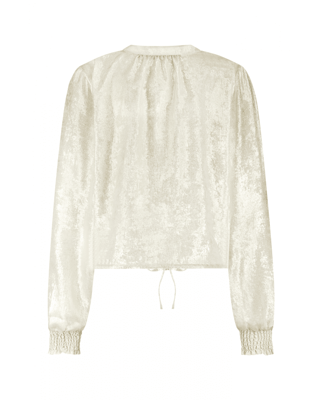 Alies – Dames blousetop van Label DOT met metallic look, striklint in de zoom en lange mouwen met gesmokte boorden