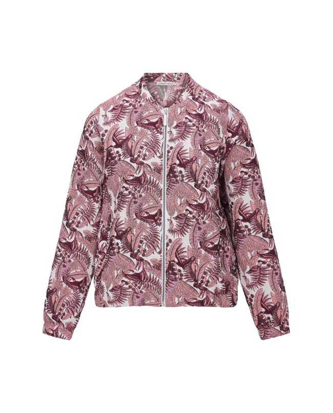 Een opvallend jasje in brokaatstijl met rijke bladprint in warme tinten. Ideaal voor frisse lentedagen of als statement piece in je zomergarderobe.